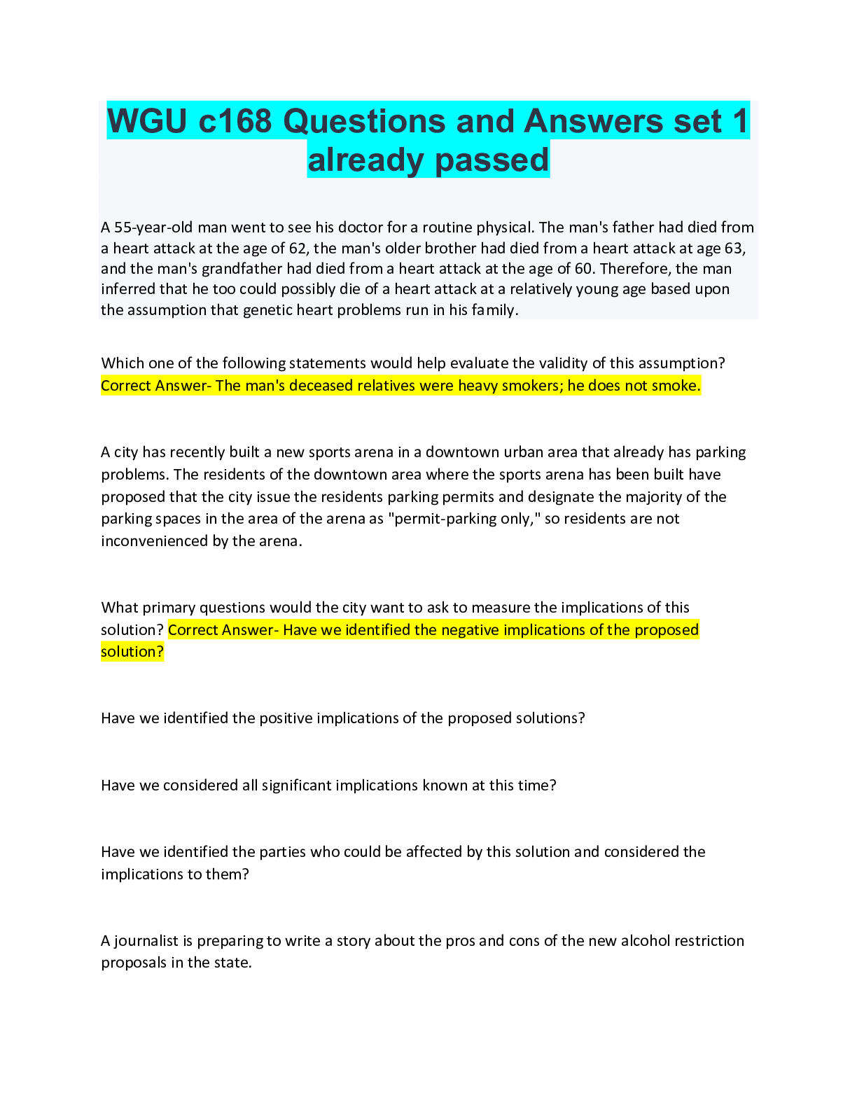 Critical Thinking > QUESTIONS & ANSWERS > WGU c168 Questions and Answers set 1 already passed 2022 (All)