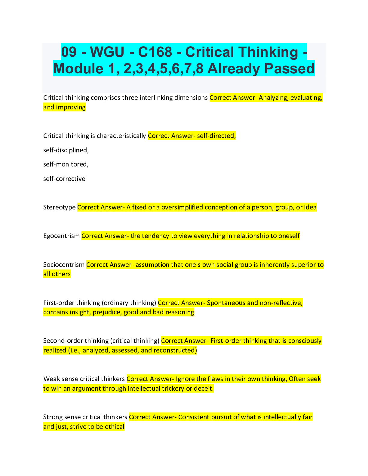 Critical Thinking > QUESTIONS & ANSWERS > 09 - WGU - C168 - Critical Thinking - Module 1, 2,3,4,5,6,7,8 Already Passed (All)