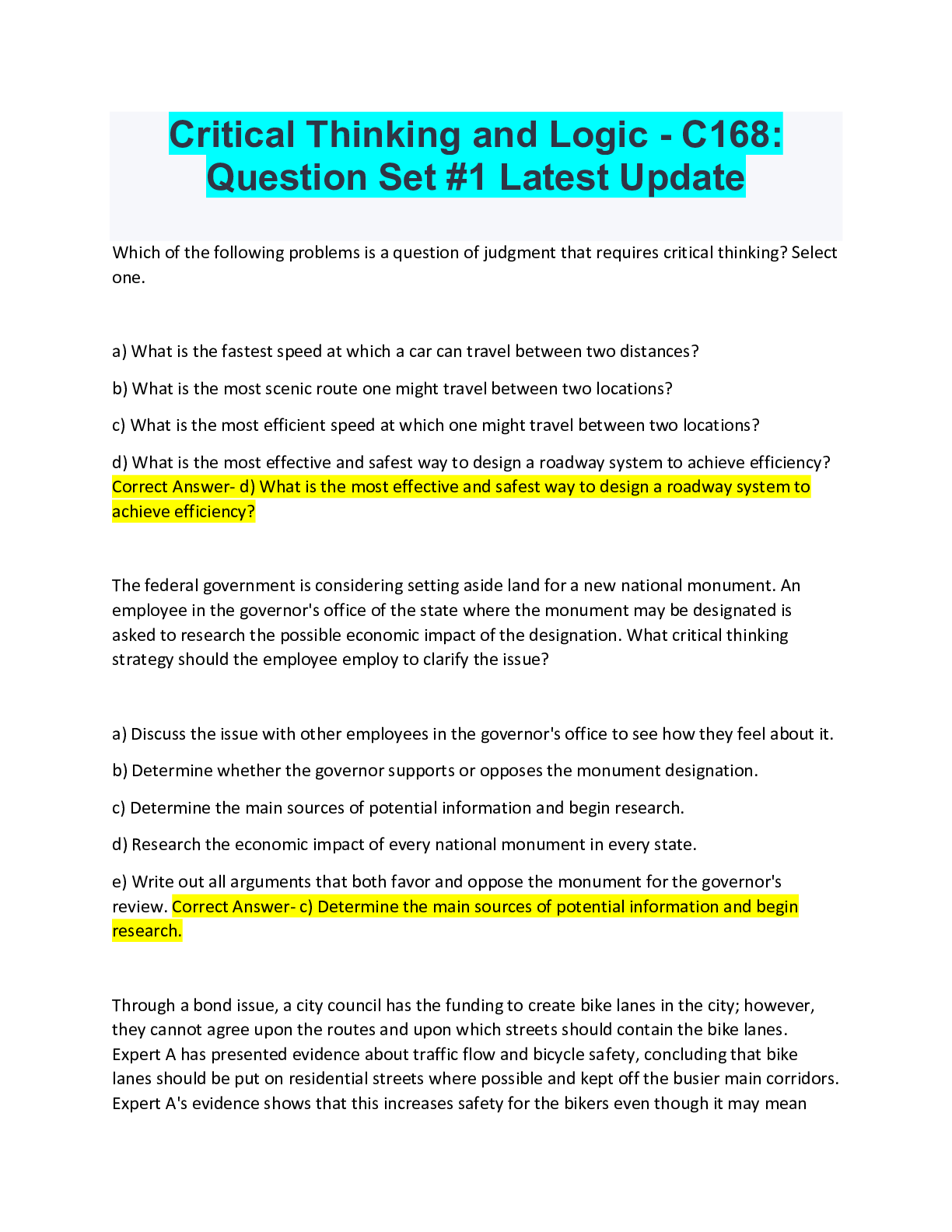 Critical Thinking > QUESTIONS & ANSWERS > Critical Thinking and Logic - C168: Question Set #1 Latest Update (All)