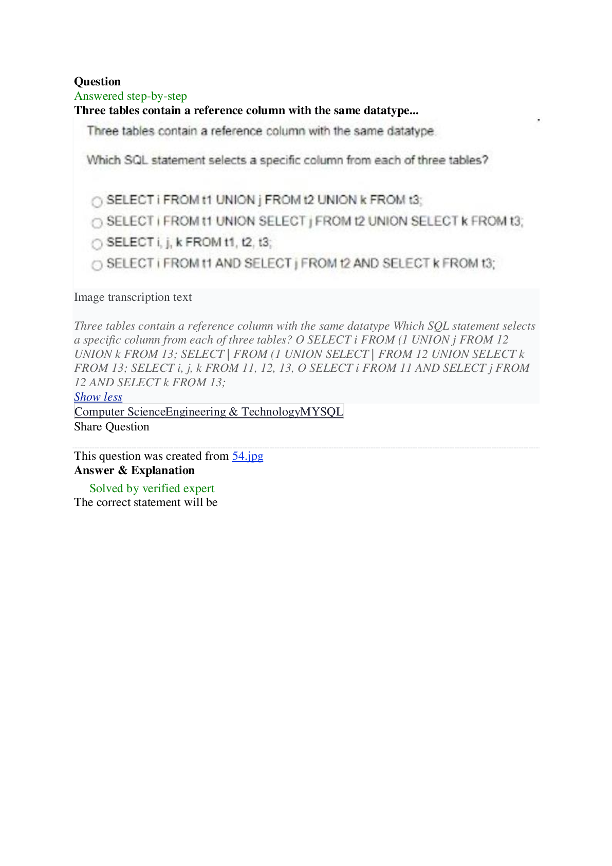 Computer Science > QUESTIONS & ANSWERS > Computer Science Engineering & Technology MYSQL Three tables contain a reference column with the same datatype Which SQL statement selects a specific column from each of three tables? O SELECT i... (All)