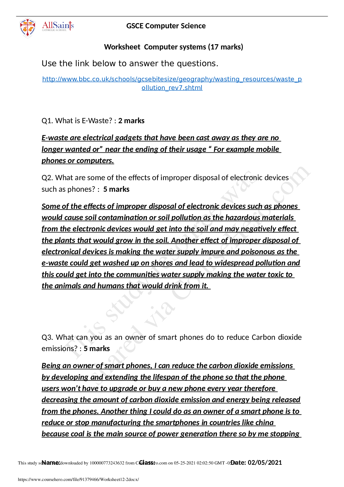 Computer Science > QUESTIONS & ANSWERS > GSCE Computer Science Worksheet Computer systems. E WASTE (All)