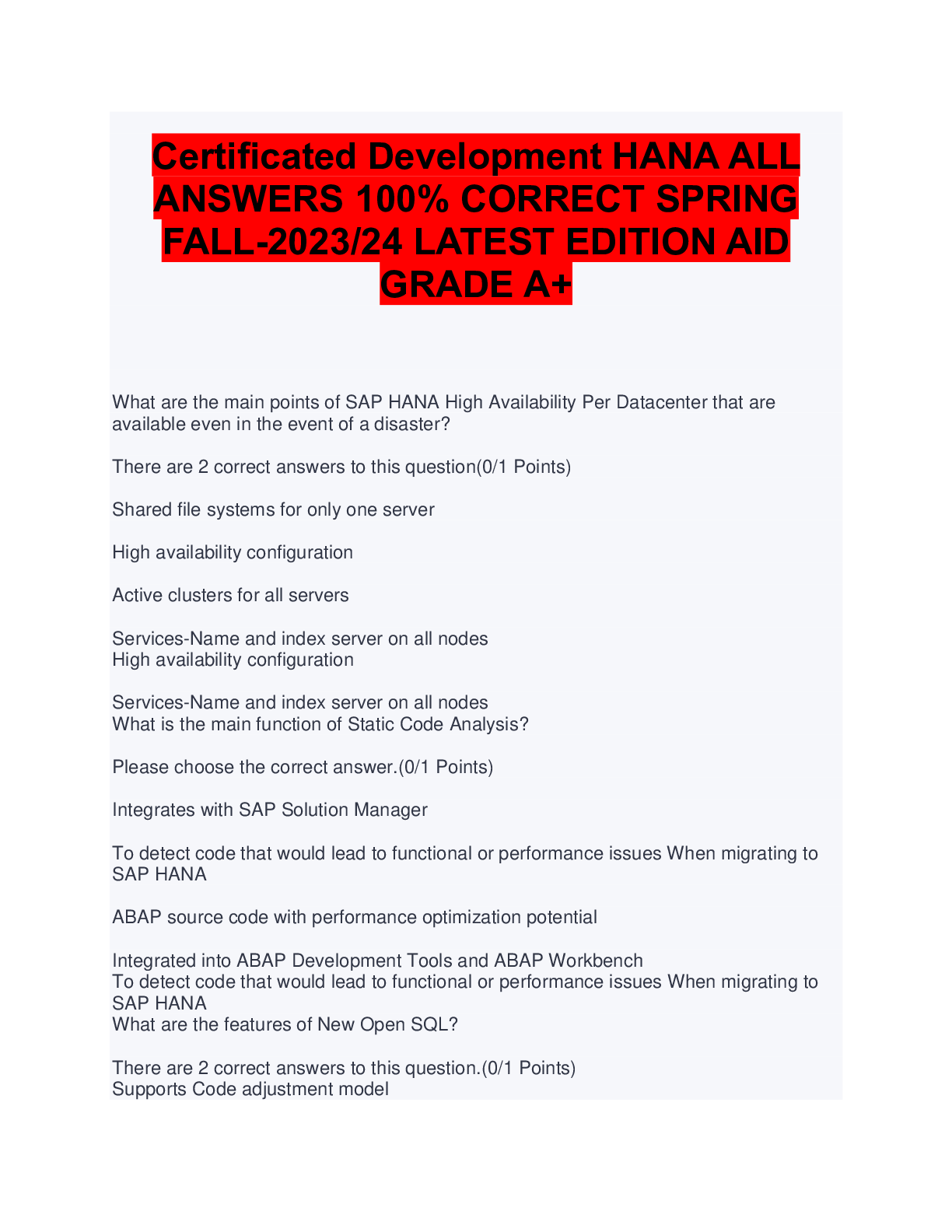Computer Architecture > EXAM > Certificated Development HANA ALL ANSWERS 100% CORRECT SPRING FALL-2023/24 LATEST EDITION AID GRADE A+ (All)