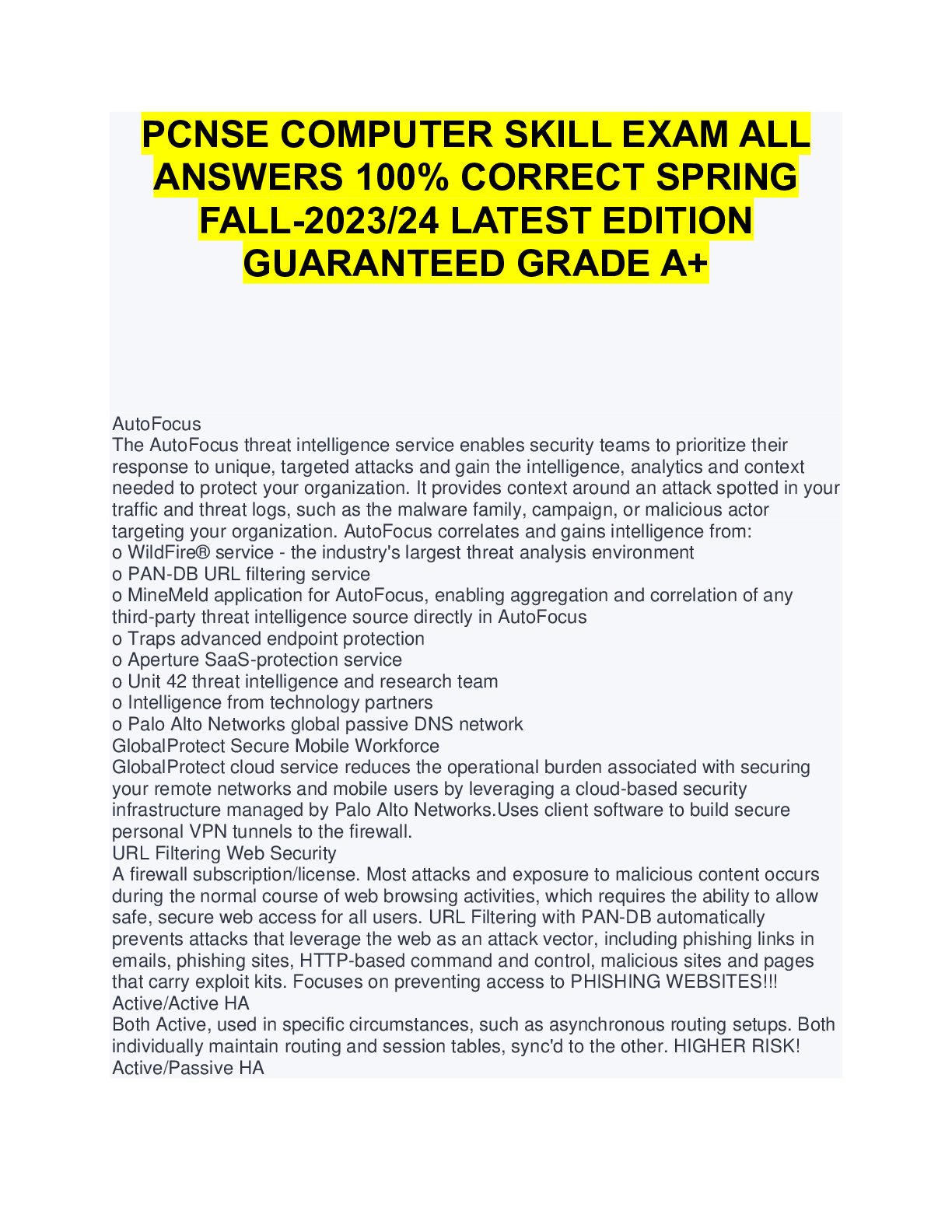 Computer Architecture > EXAM > PCNSE COMPUTER SKILL EXAM ALL ANSWERS 100% CORRECT SPRING FALL-2023/24 LATEST EDITION GUARANTEED GRADE A+ (All)