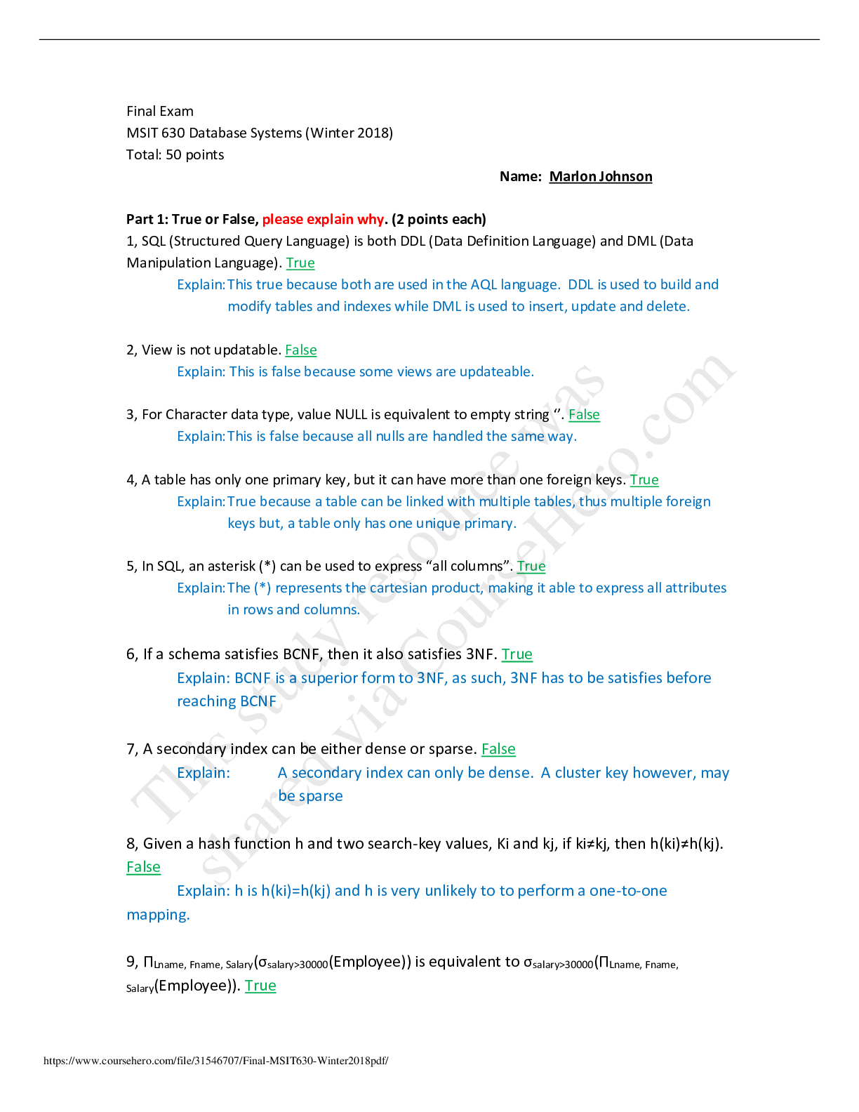 Computer Architecture > EXAM > MSIT 630 Database Systems FINAL EXAM. (All)