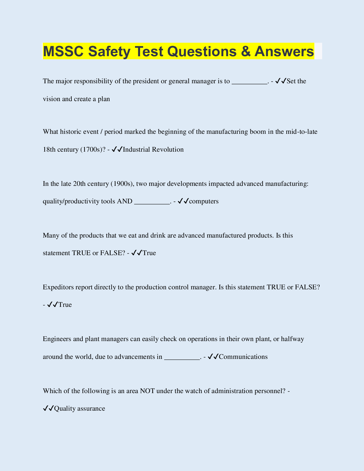 Logistics > QUESTIONS & ANSWERS > MSSC Safety Test Questions & Answers (All)