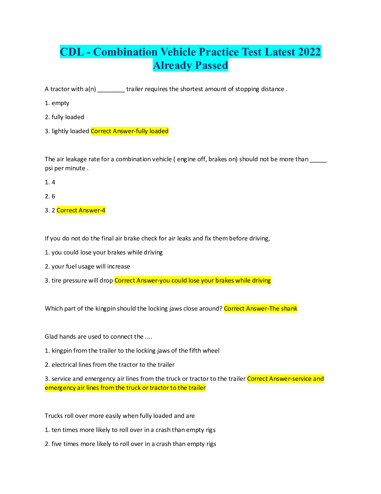 Logistics > QUESTIONS & ANSWERS > CDL - Combination Vehicle Practice Test (All)