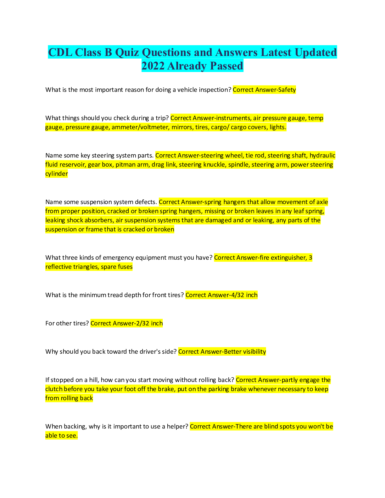 Logistics > QUESTIONS & ANSWERS > CDL Class B Quiz Questions and Answers Latest Updated 2022 Already Passed (All)