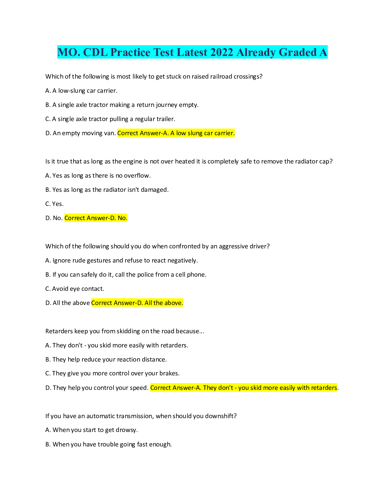Logistics > QUESTIONS & ANSWERS > MO. CDL Practice Test Latest 2022 Already Graded A (All)