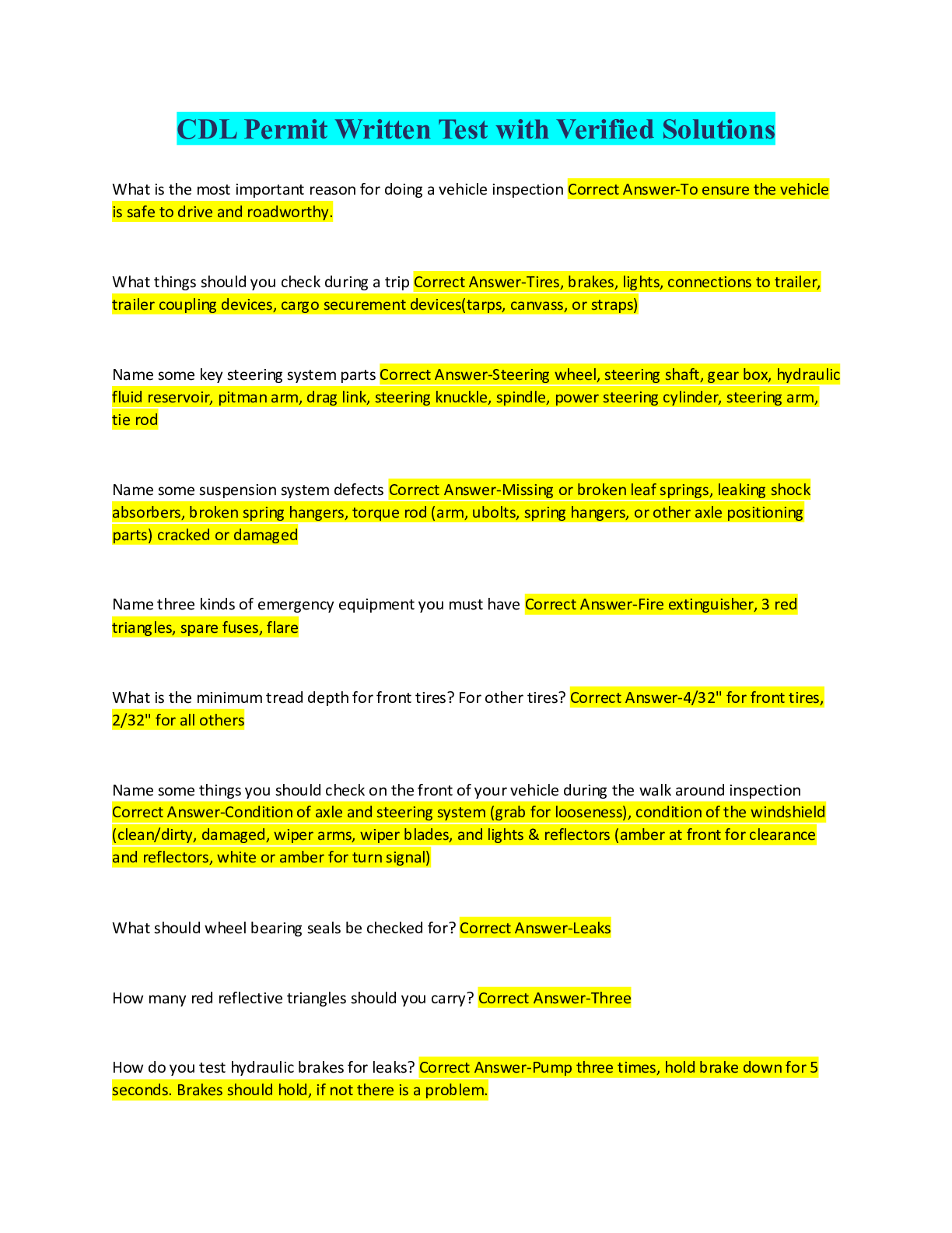 Logistics > QUESTIONS & ANSWERS > CDL Permit Written Test with Verified Solutions (All)