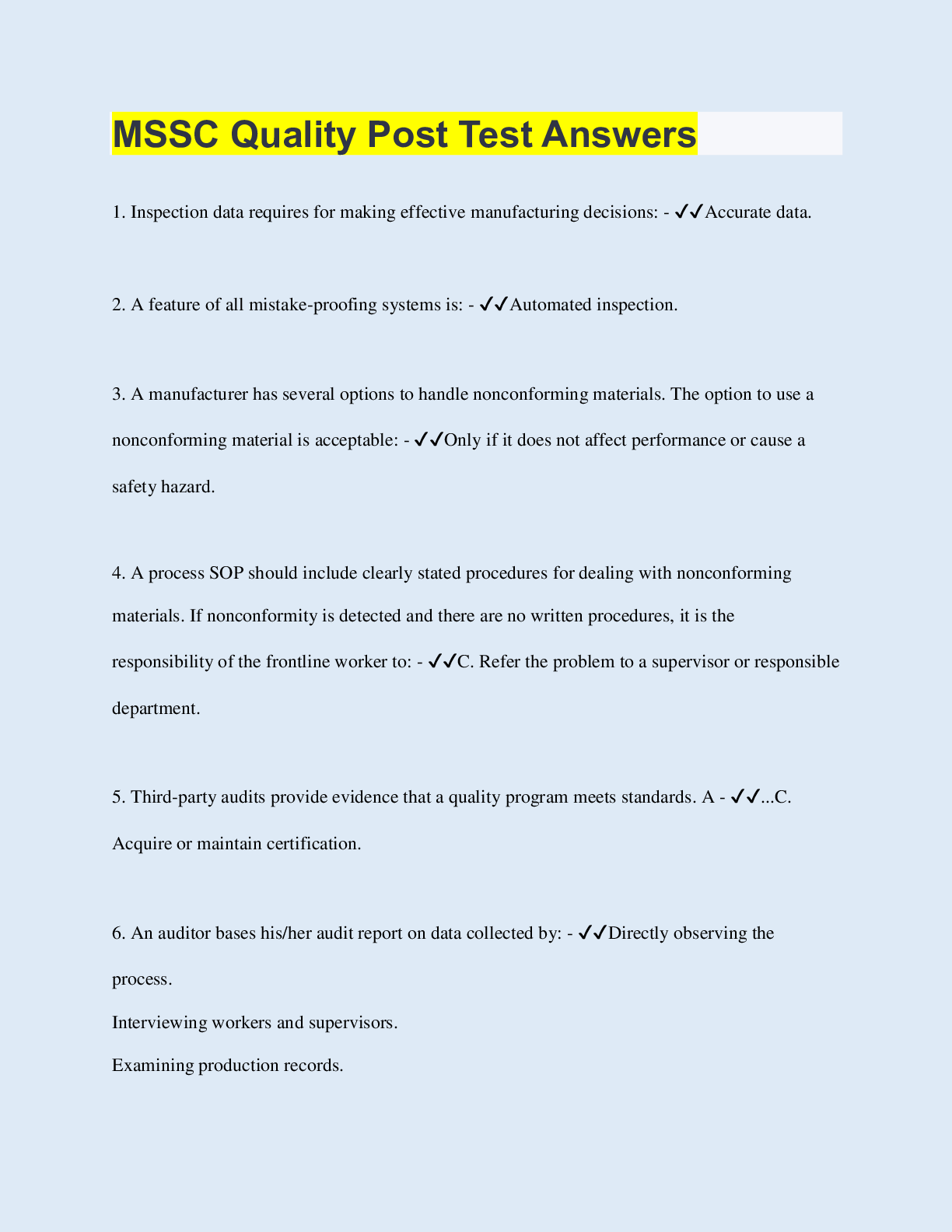 Logistics > QUESTIONS & ANSWERS > MSSC Quality Post Test Answers (All)