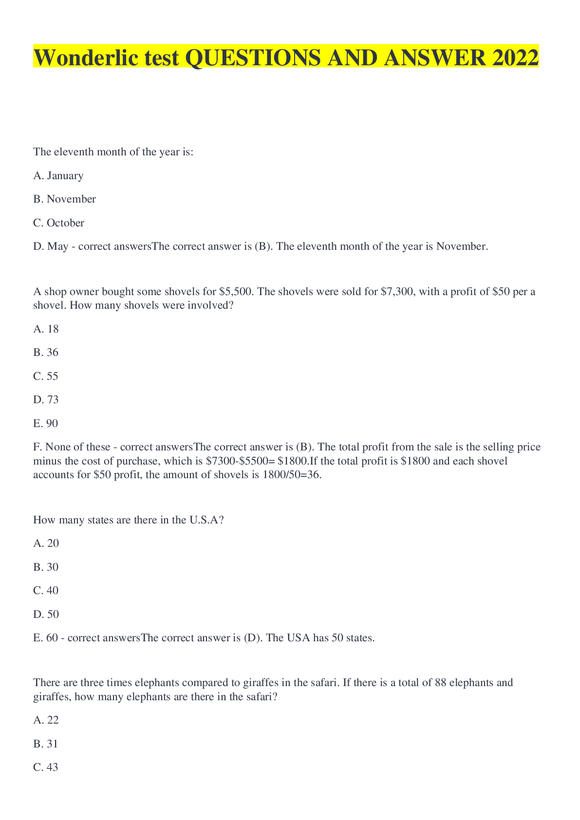 Logistics > EXAM > Wonderlic test QUESTIONS AND ANSWER 2022 (All)