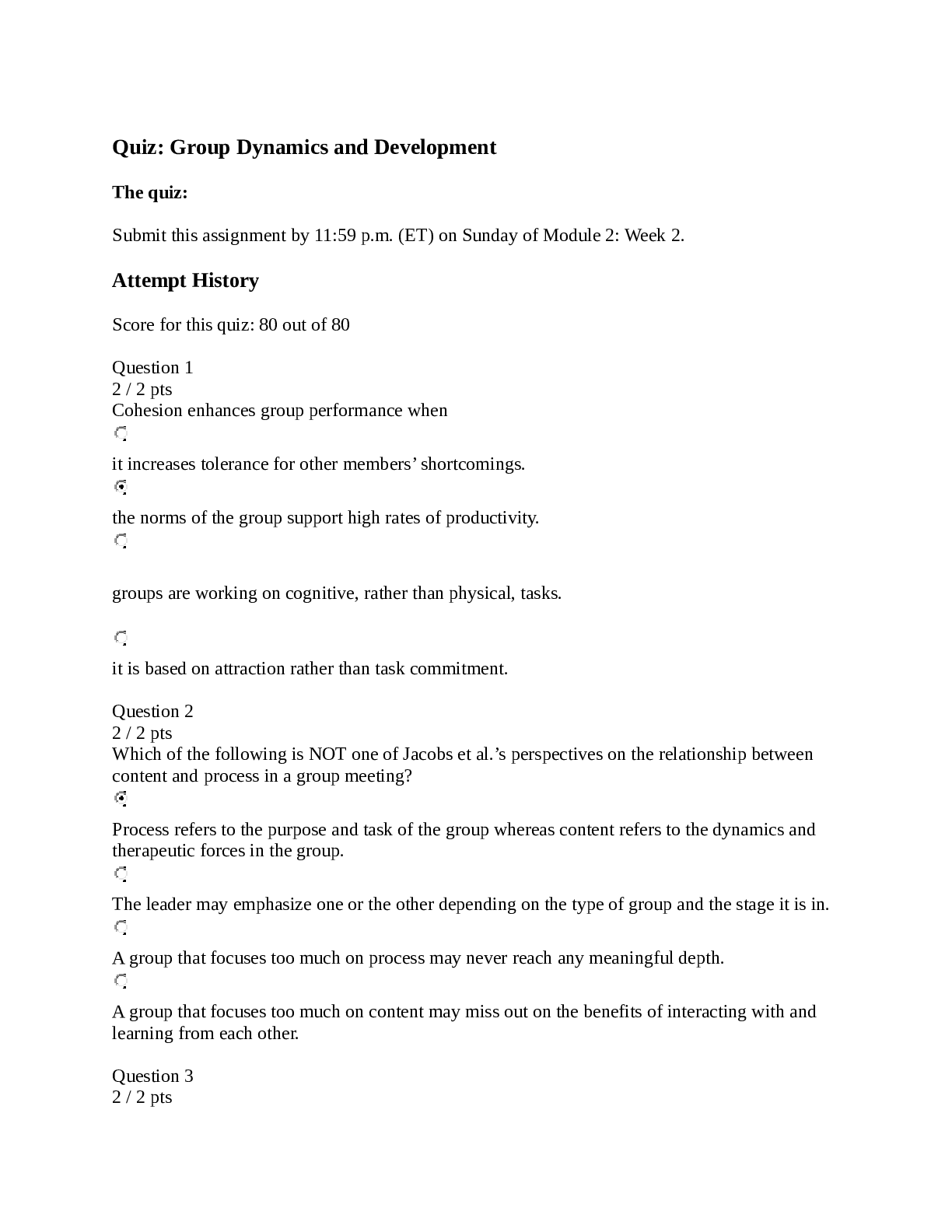 SCIENCE 101 > QUESTIONS & ANSWERS > Liberty University HSCO 511 QUIZ 1 Group Dynamics and Development- Questions with Verified Answers (All)