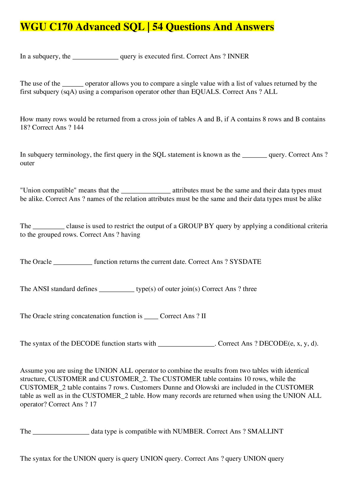 Database Management > EXAM > WGU C170 Advanced SQL | 54 Questions And Answers (All)