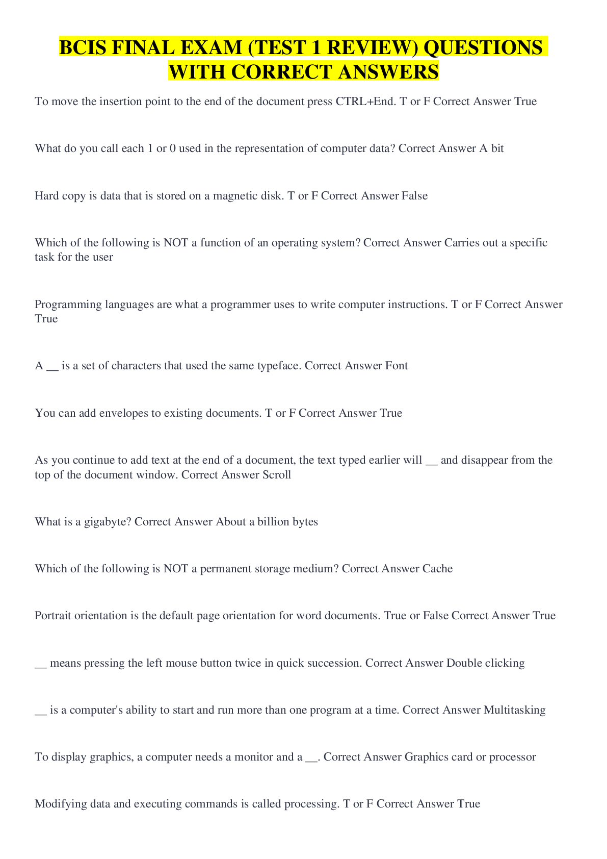 Database Management > QUESTIONS & ANSWERS > BCIS FINAL EXAM (TEST 1 REVIEW) QUESTIONS WITH CORRECT ANSWERS (All)