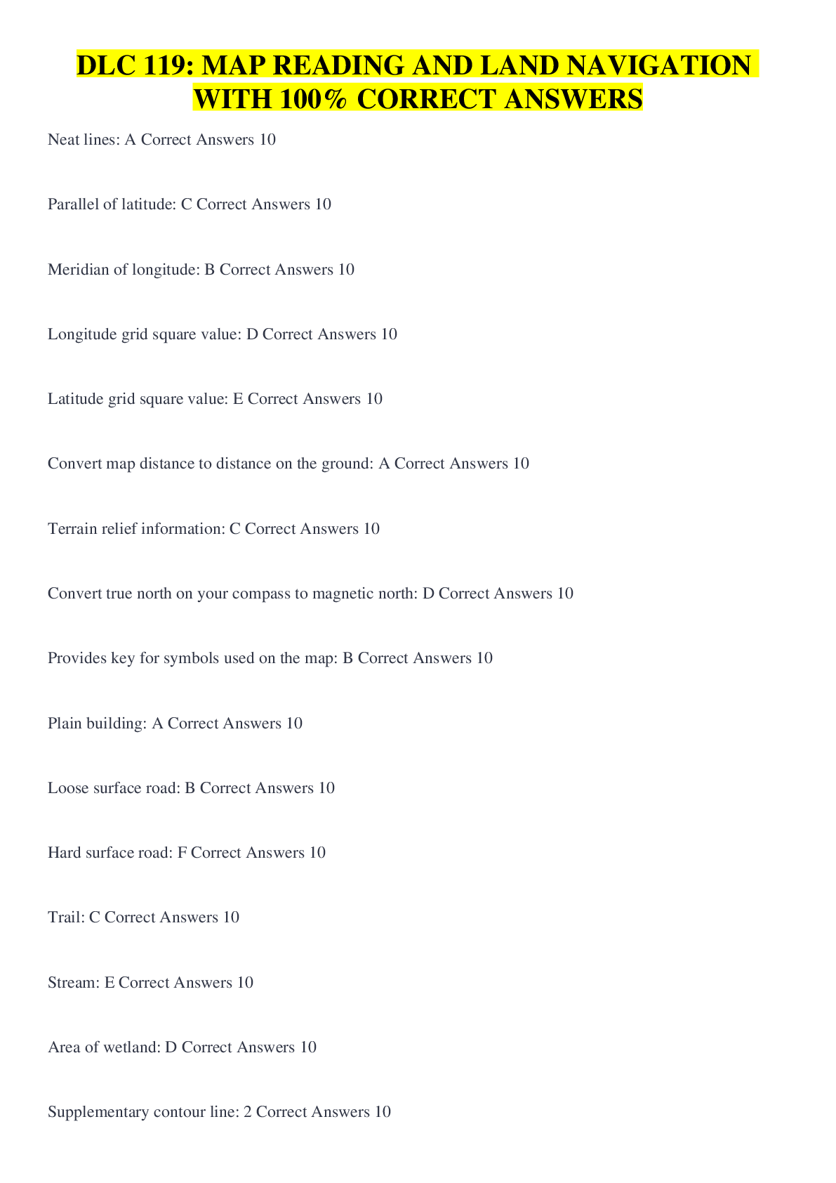 Database Management > QUESTIONS & ANSWERS > DLC 119: MAP READING AND LAND NAVIGATION WITH 100% CORRECT ANSWERS (All)