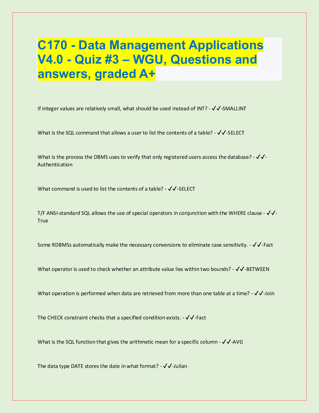 Database Management > QUESTIONS & ANSWERS > WGU C170 Basic SQL, Top Exam Questions and answers, 100% Accurate, graded A+ (All)