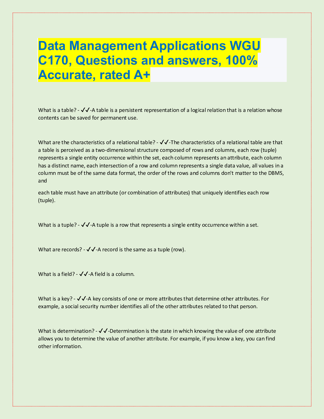 Database Management > QUESTIONS & ANSWERS > C170, WGU Full Study Pack, Questions with accurate answers, 100% Accurate, rated A+ (All)