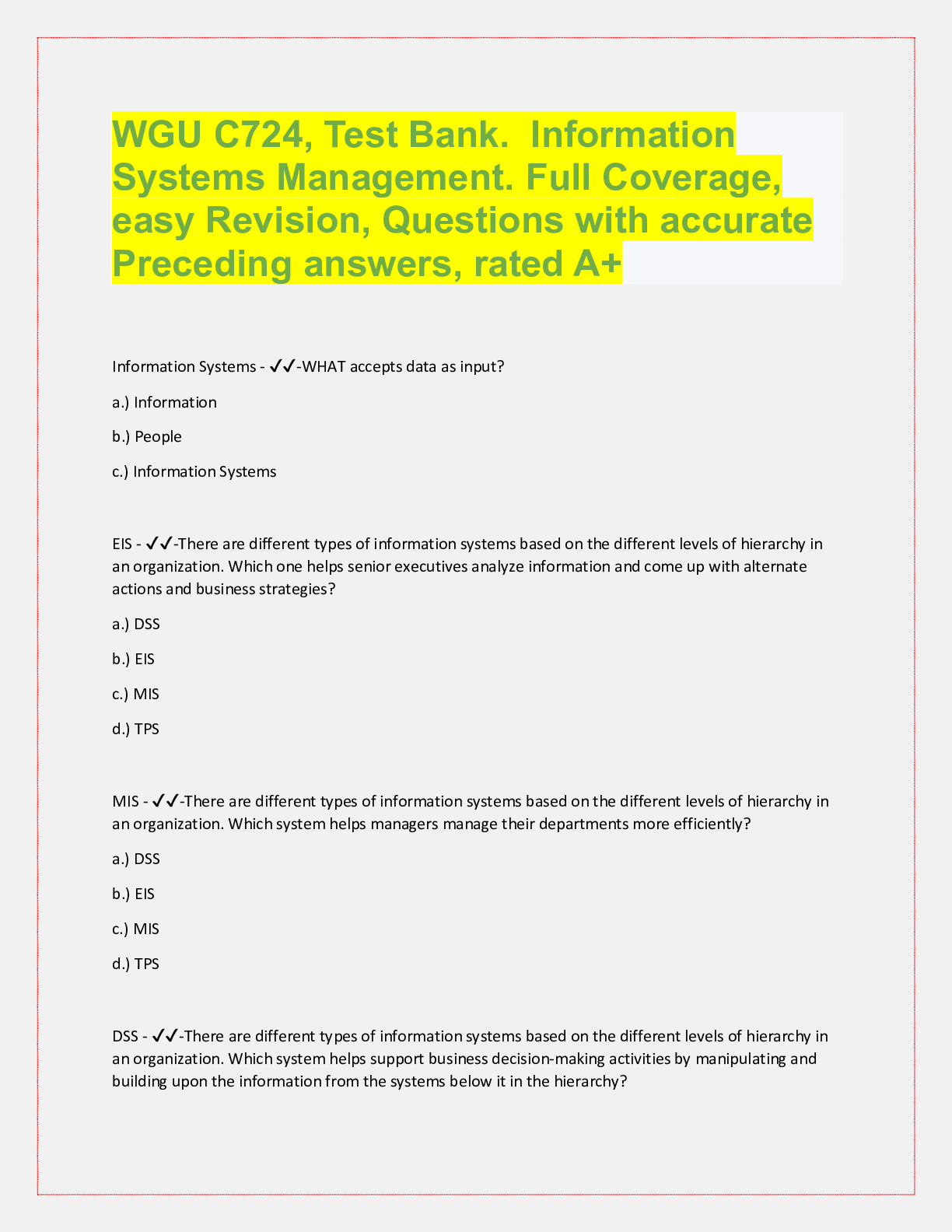 Database Management > QUESTIONS & ANSWERS > WGU C724, Test Bank. Information Systems Management. Full Coverage, easy Revision, Questions with accurate Preceding answers, rated A+ (All)