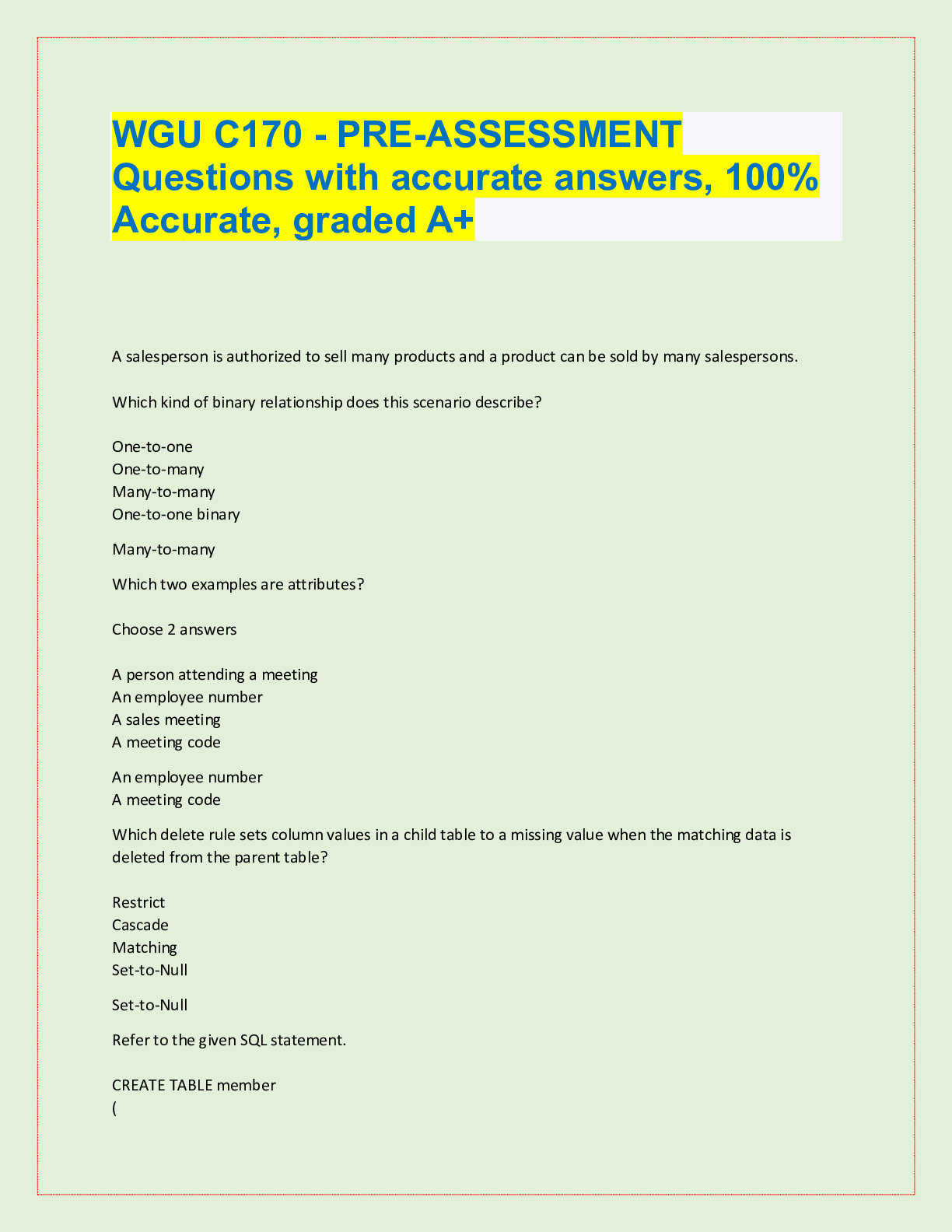 Database Management > QUESTIONS & ANSWERS > WGU C170 - PRE-ASSESSMENT Questions with accurate answers, 100% Accurate, graded A+ (All)