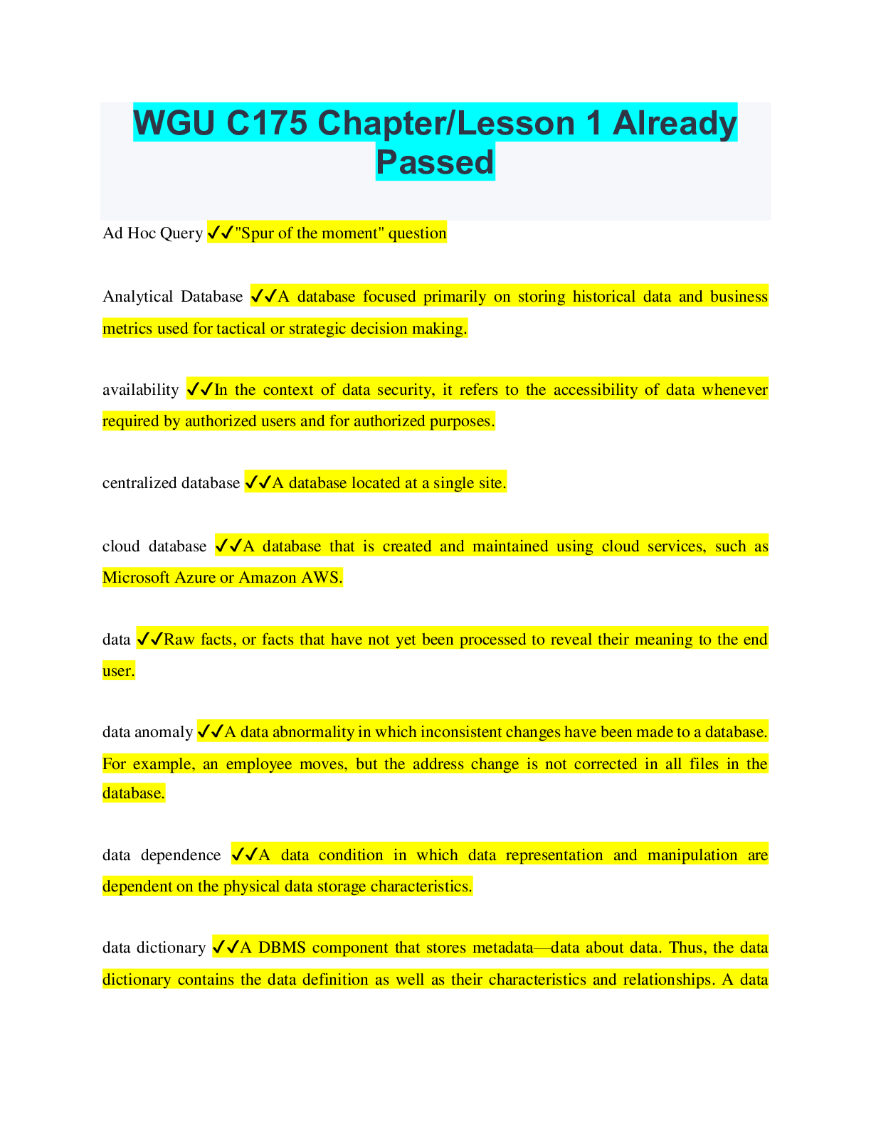 Database Management > QUESTIONS & ANSWERS > WGU C175 Chapter/Lesson 1 Already Passed (All)