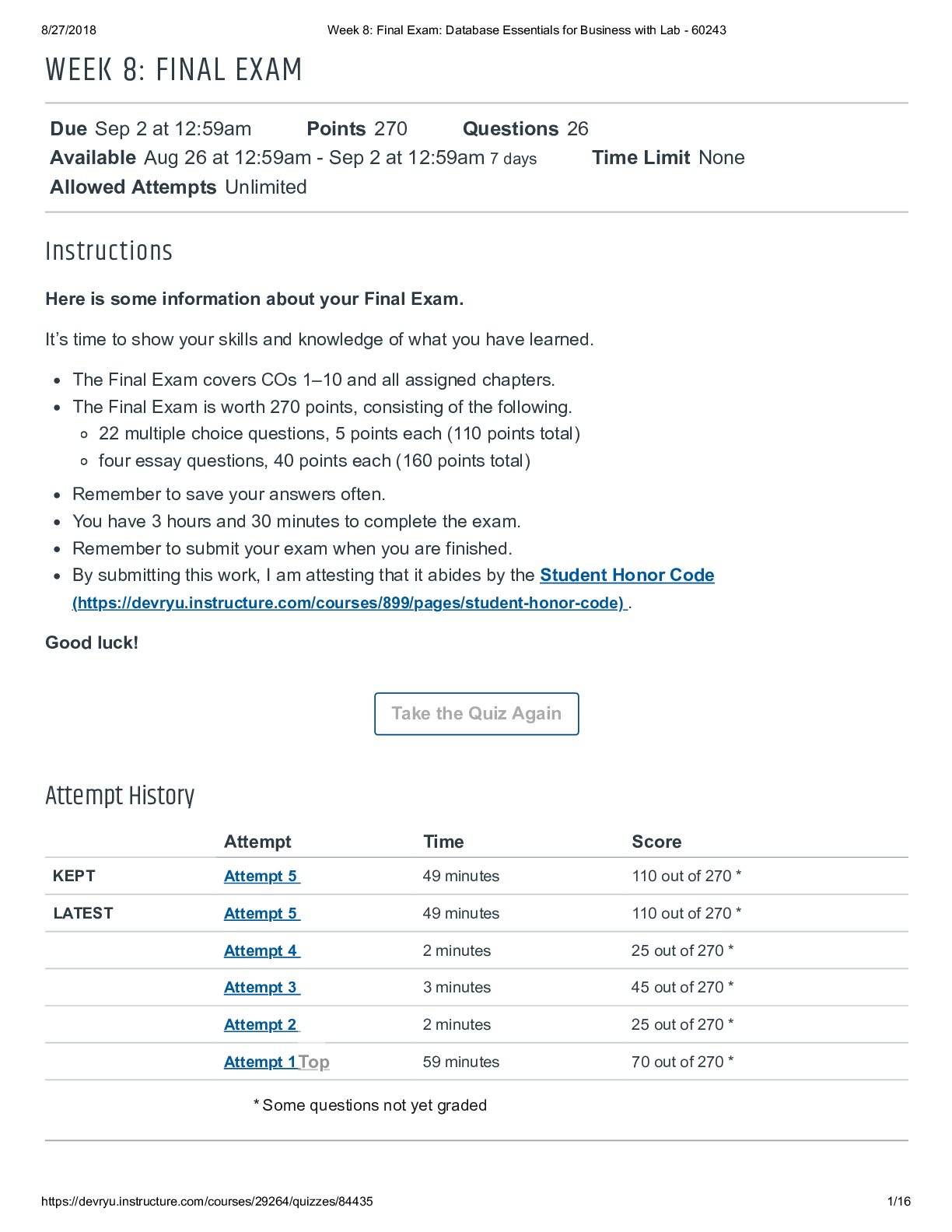 Database Management > EXAM > BIS 245 Week 8 Final 5 {GRADED A) EXAM | SCORE 270 Points | 100% SATISFACTION | DeVry University. (All)