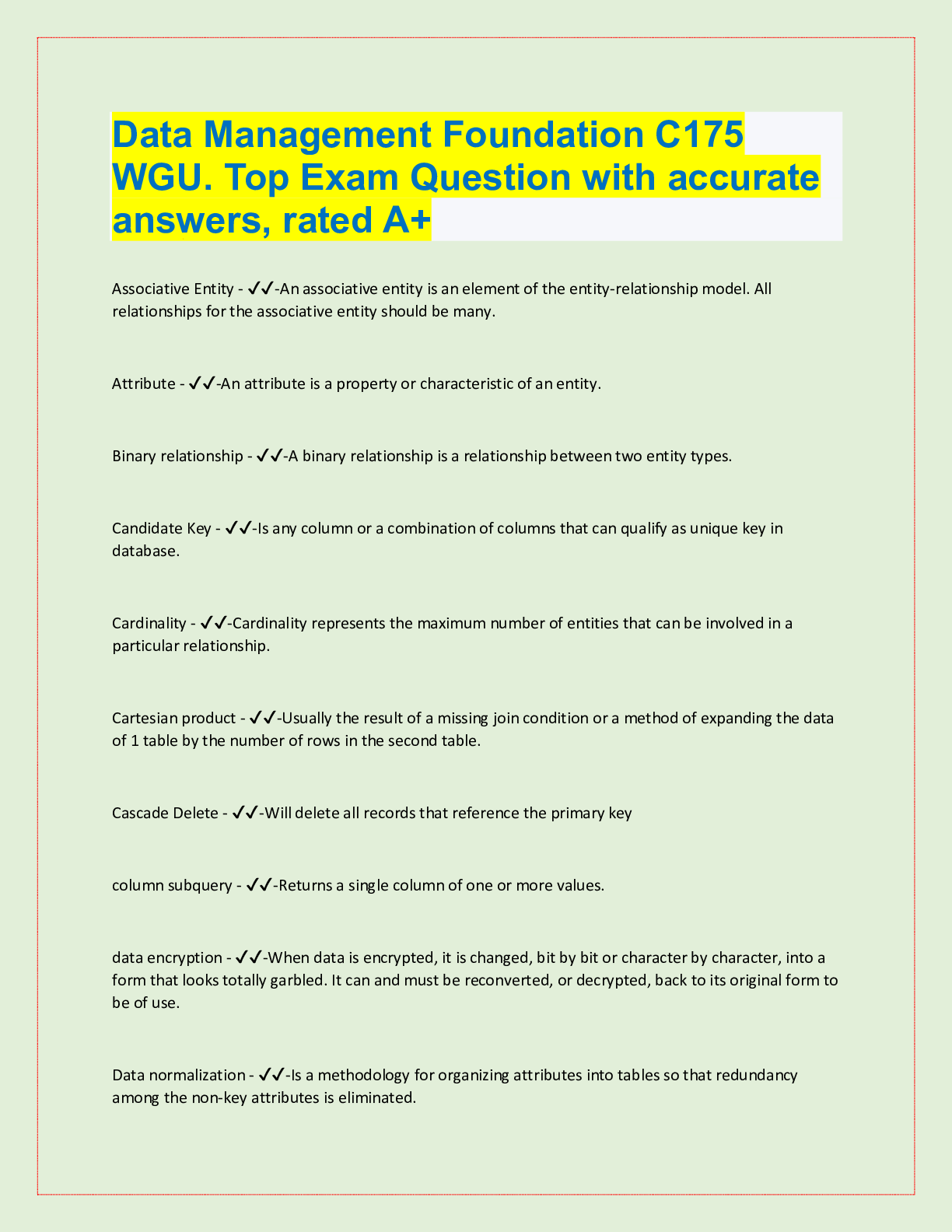 Database Management > QUESTIONS & ANSWERS > WGU-C175, Top Exam Question with accurate answers, 100% Accurate, rated A+ (All)