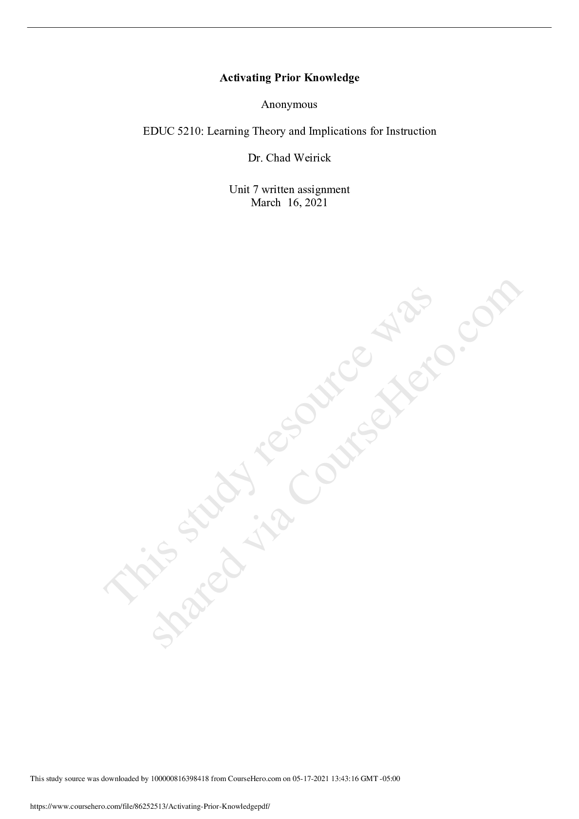 Education > Research Paper > Activating Prior Knowledge EDUC 5210: Learning Theory and Implications for Instruction (All)