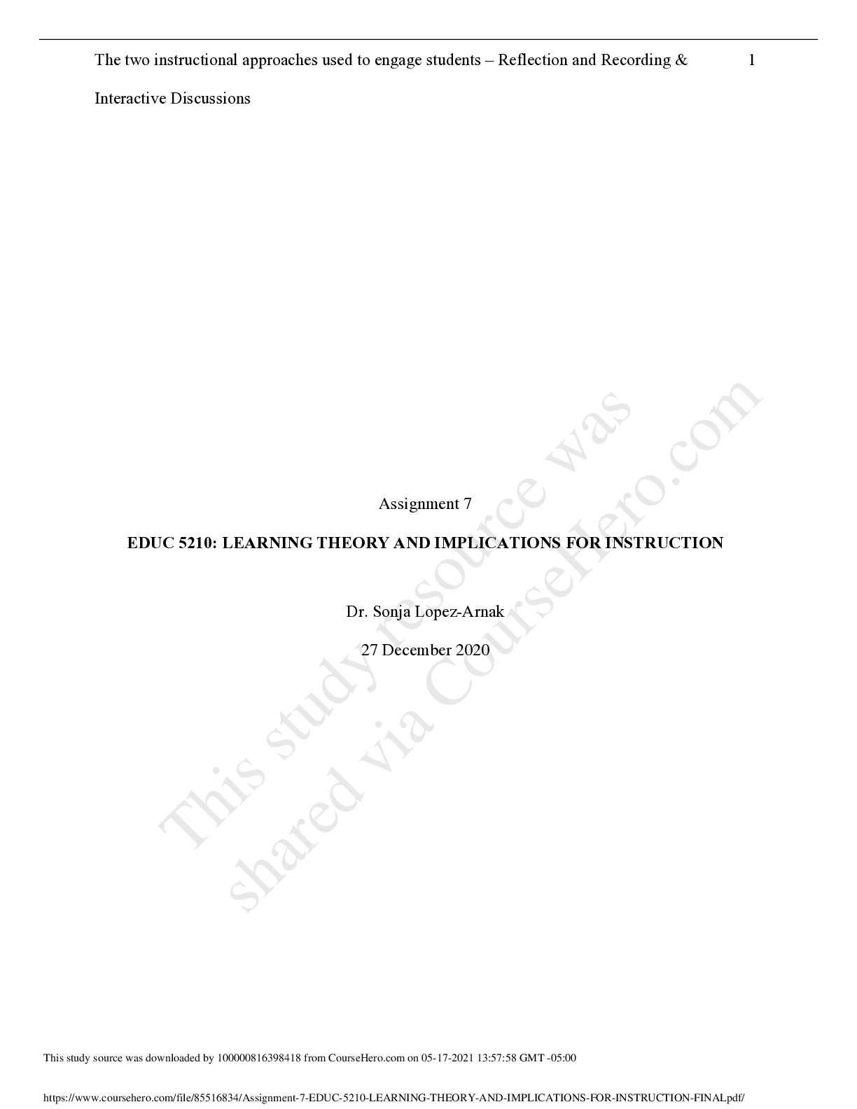 Education > Research Paper > Assignment 7 EDUC 5210: LEARNING THEORY AND IMPLICATIONS FOR INSTRUCTION University of the People (All)