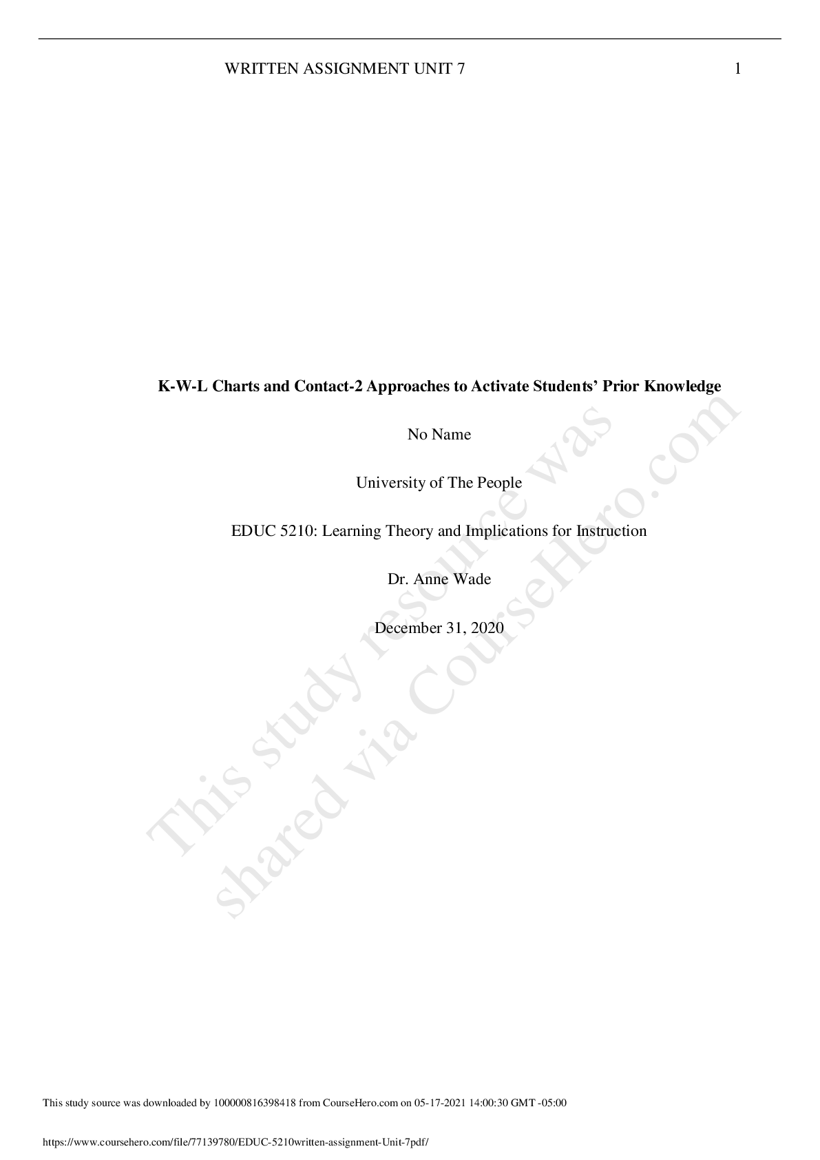 Education > Research Paper > K-W-L Charts and Contact-2 Approaches to Activate Students’ Prior Knowledge No Name University of The People EDUC 5210: Learning Theory and Implications for Instruction University of the PeopleEDUC 5210EDUC 5210written assignment Unit 7 (All)