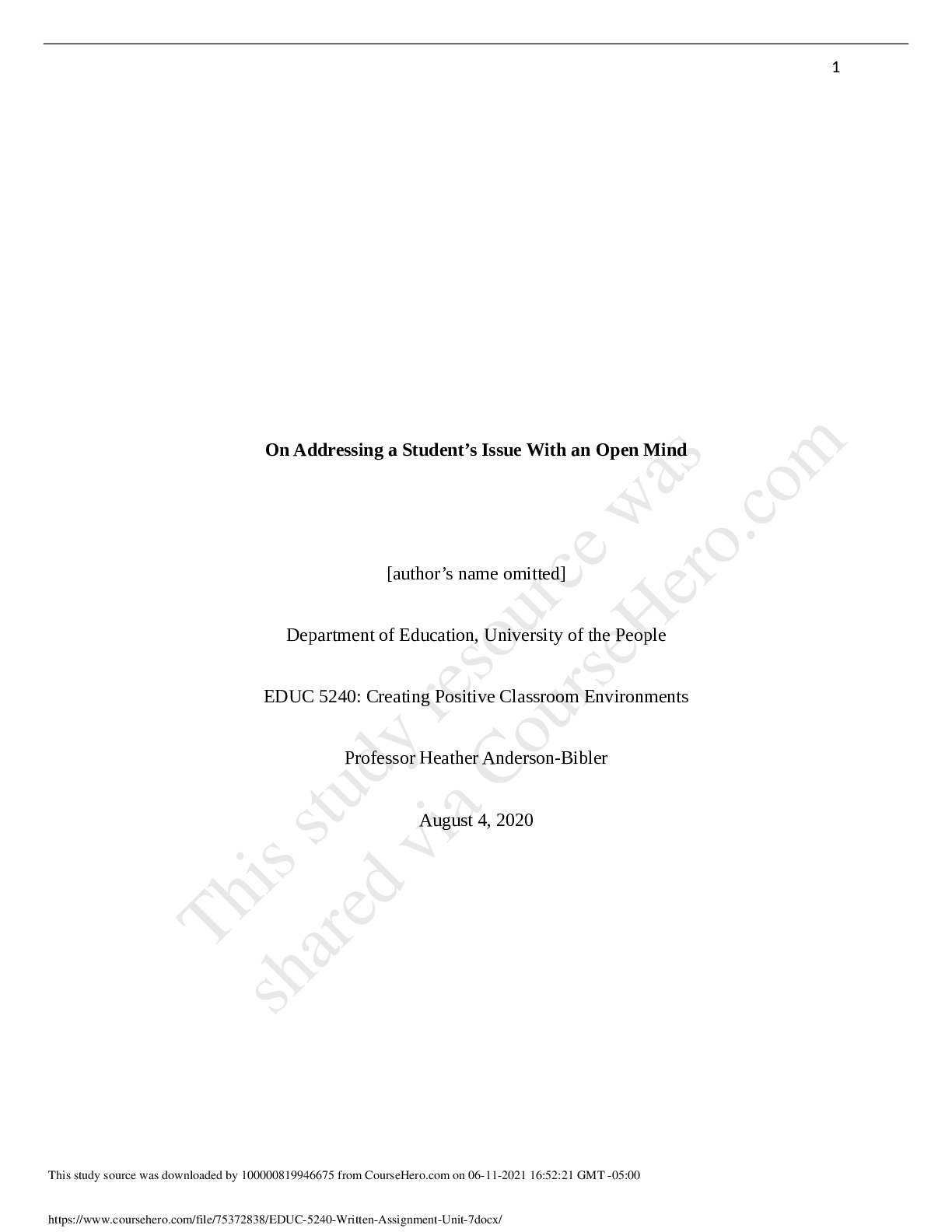 Education > Research Paper > Creating Positive Classroom Environments University of the People EDUCATION 5710EDUC 5240 - Written Assignment Unit 7 On Addressing a Student’s Issue With an Open Mind (All)