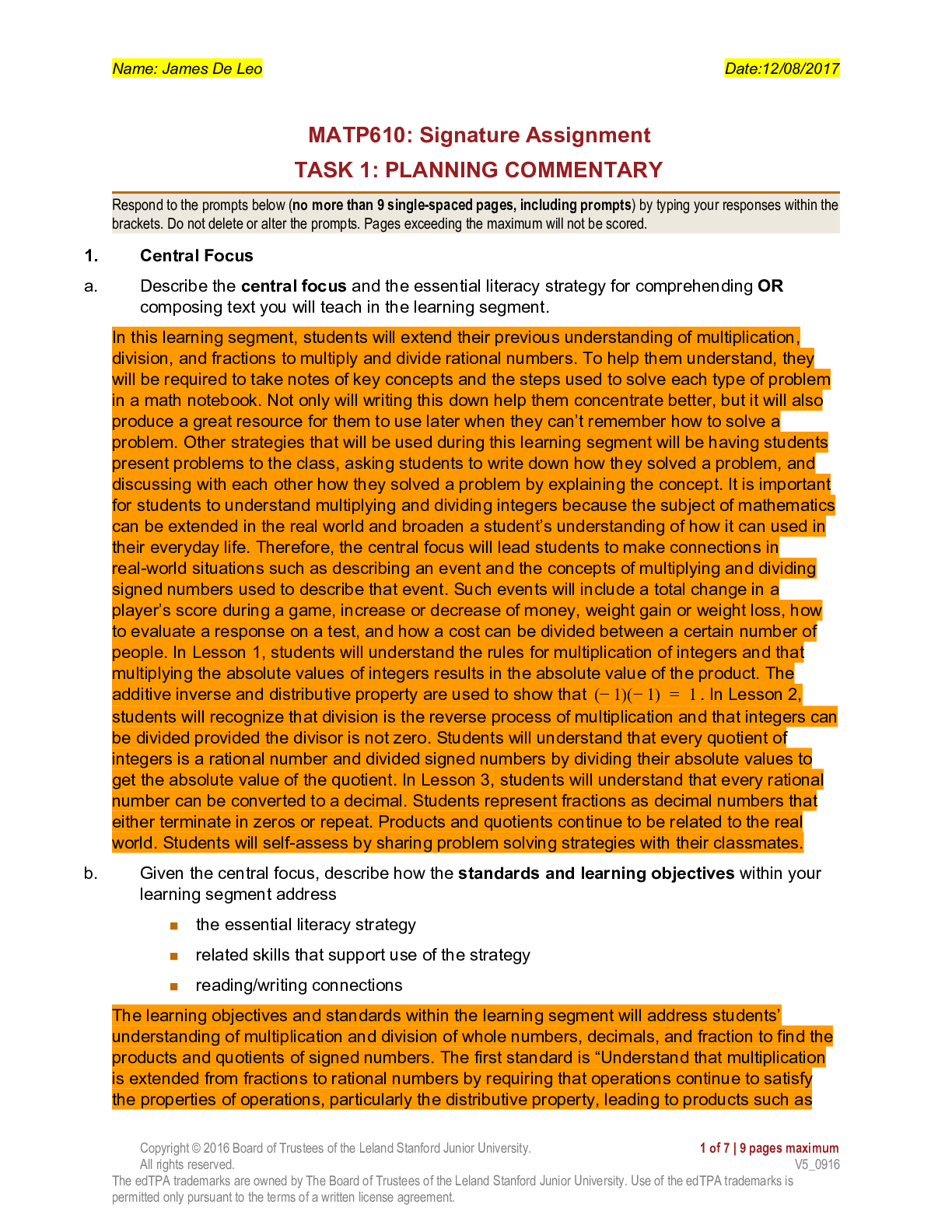 Education > AQA QUESTION and MARK SCHEMES > MATP610: Signature Assignment TASK 1: PLANNING COMMENTARY (All)