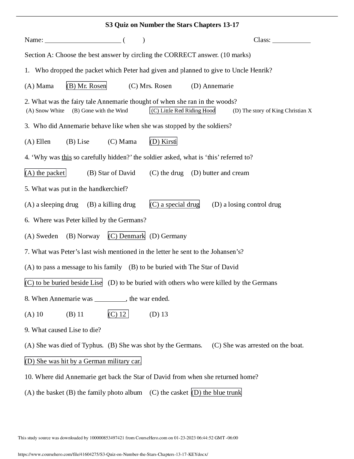 Chinese > Quiz > S3 Quiz on Number the Stars Chapters 13-17 | Download for quality grades | (All)