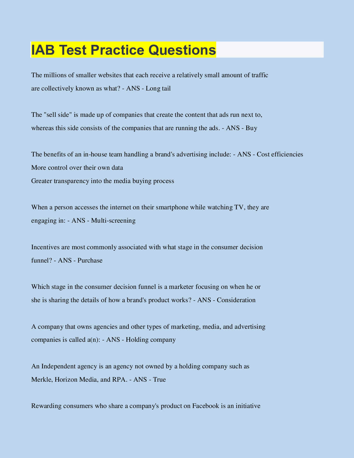 Media Studies > QUESTIONS & ANSWERS > IAB Test Practice Questions (All)