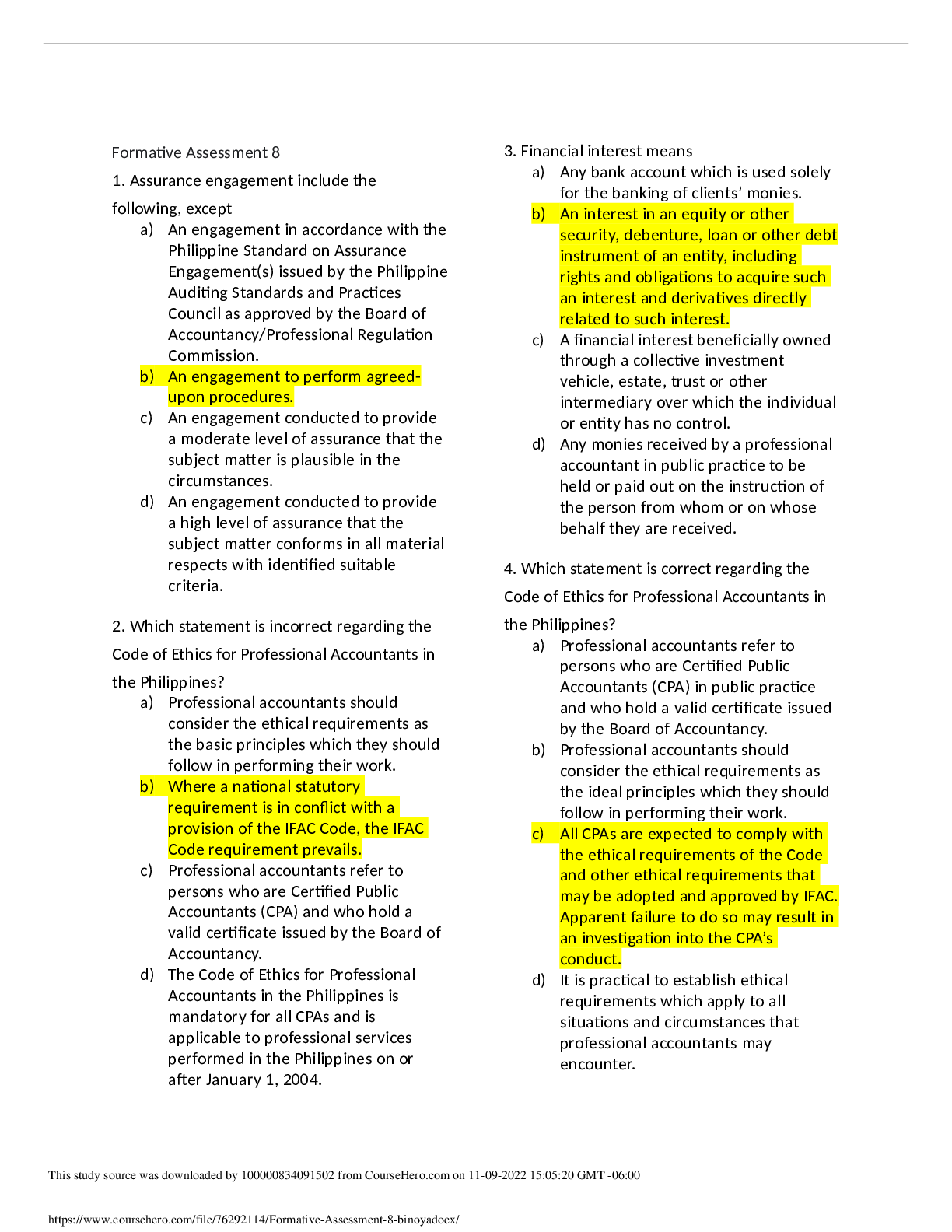 Auditing > QUESTIONS & ANSWERS > Formative Assessment 8 binoya.docx | Download for quality grades (All)
