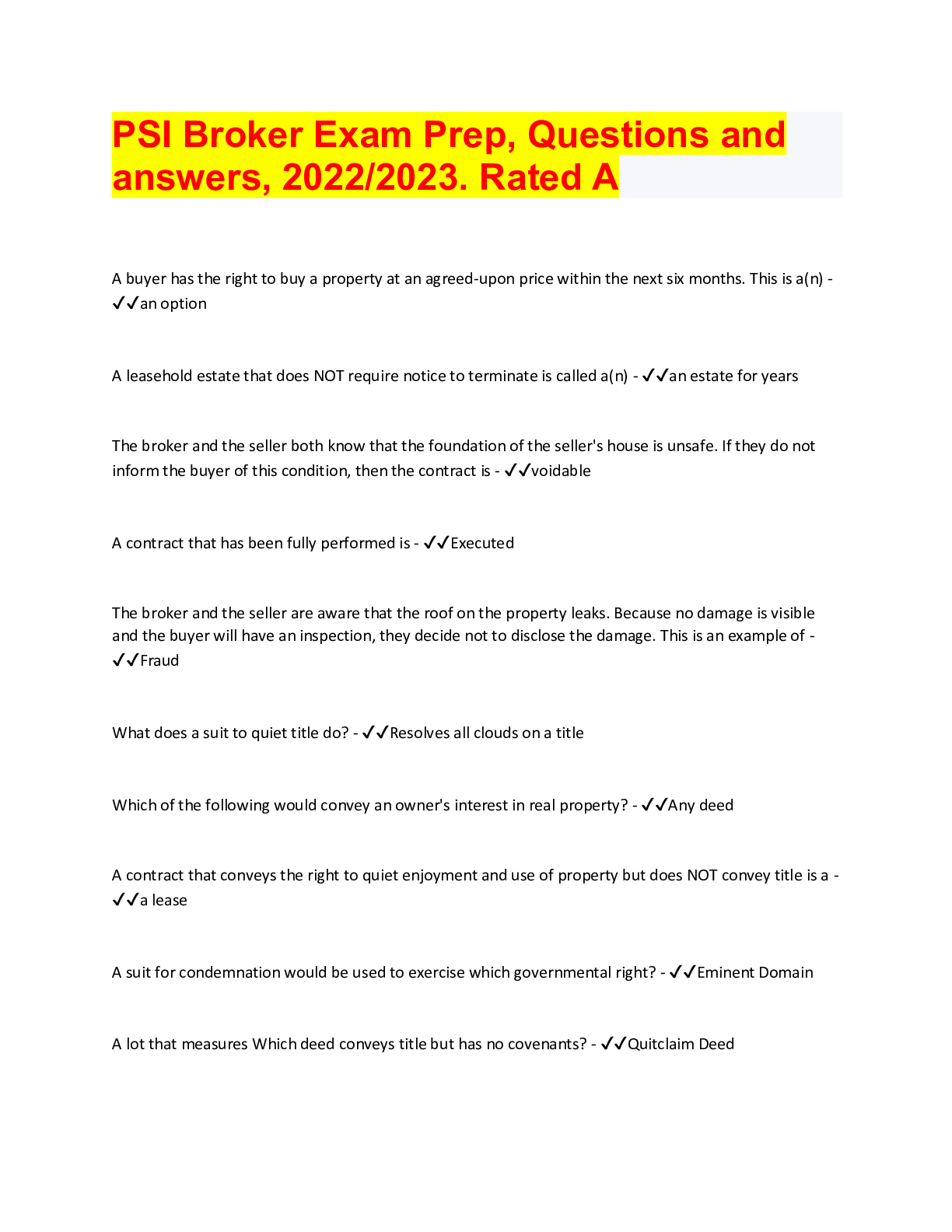 Auditing > QUESTIONS & ANSWERS > PSI Broker Exam Prep, Questions and answers, 2022/2023. Rated A (All)