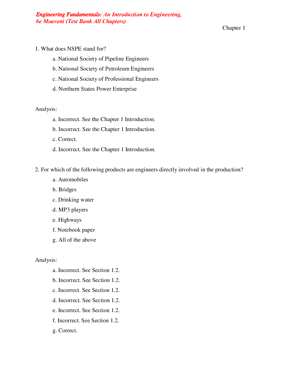 Engineering > TEST BANKS > Engineering Fundamentals An Introduction to Engineering, 6e Moaveni (Test Bank) (All)