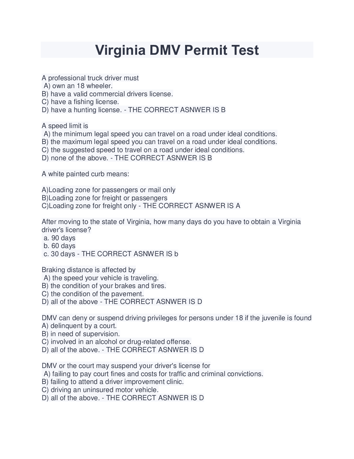 Engineering > EXAM > Virginia DMV Permit Test (2022/2023) Satisfaction Guaranteed to Pass (All)