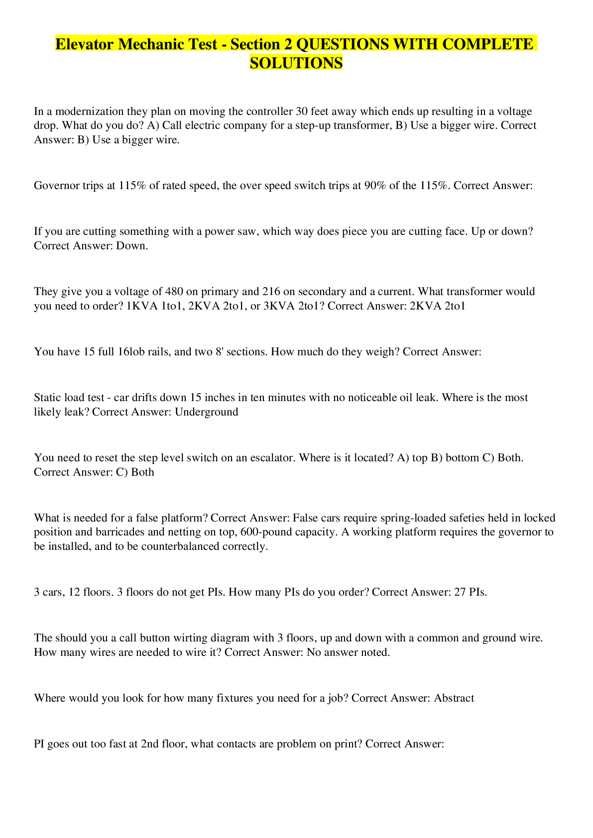 Engineering > EXAM > Elevator Mechanic Test - Section 2 QUESTIONS WITH COMPLETE SOLUTIONS (All)