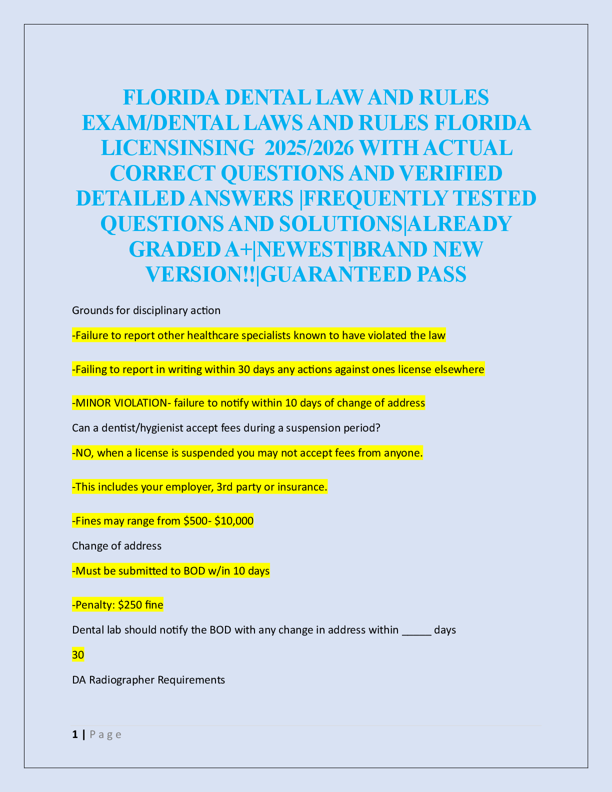 Dentistry > EXAM > FLORIDA DENTAL LAW AND RULES EXAM/DENTAL LAWS AND RULES FLORIDA LICENSINSING (All)