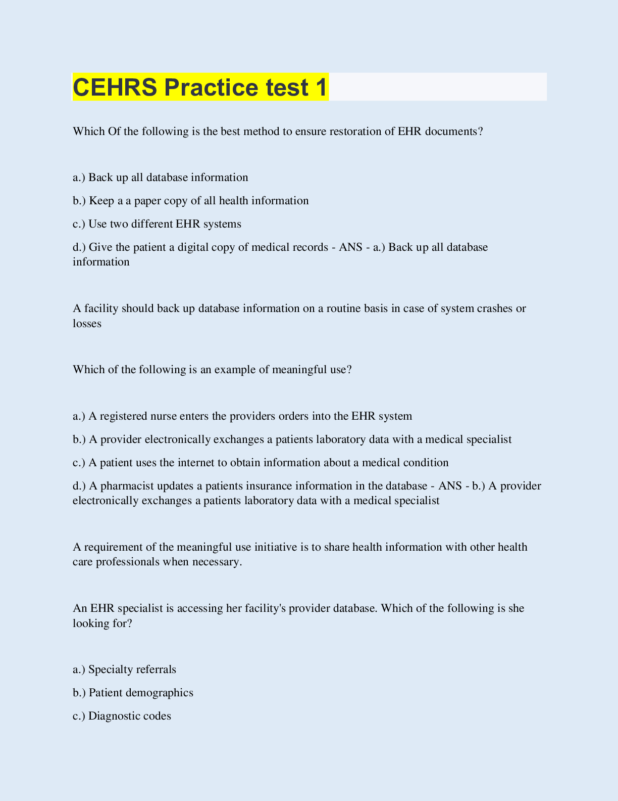 Health Computing > QUESTIONS & ANSWERS > CEHRS Practice test 1 (All)