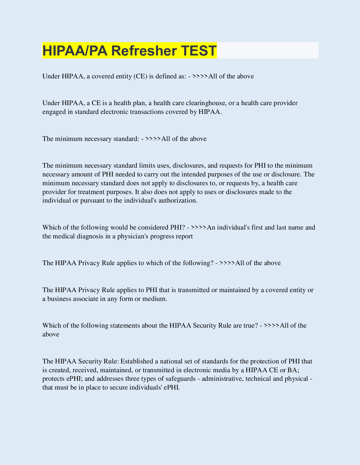 Health Computing > QUESTIONS & ANSWERS > HIPAA/PA Refresher TEST (All)
