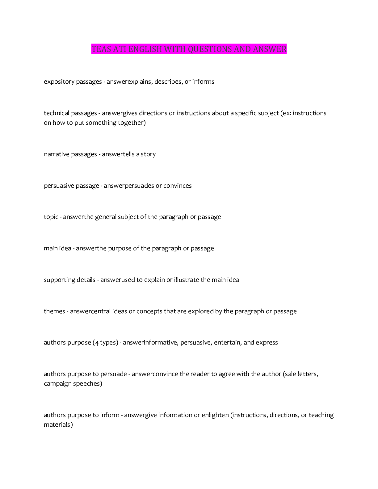 English > QUESTIONS & ANSWERS > TEAS ATI ENGLISH WITH QUESTIONS AND ANSWER (All)