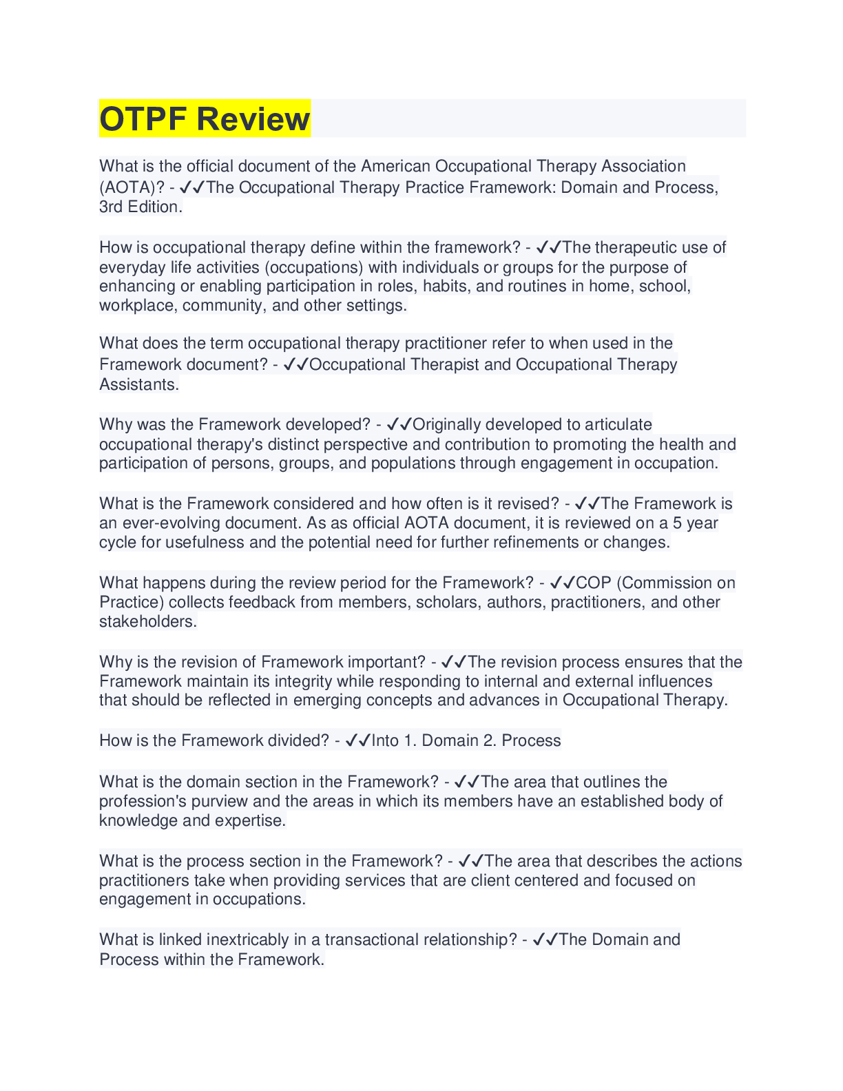 Occupational Therapy > EXAM REVIEW > OTPF Review | 48 Questions with 100% Correct Answers (All)