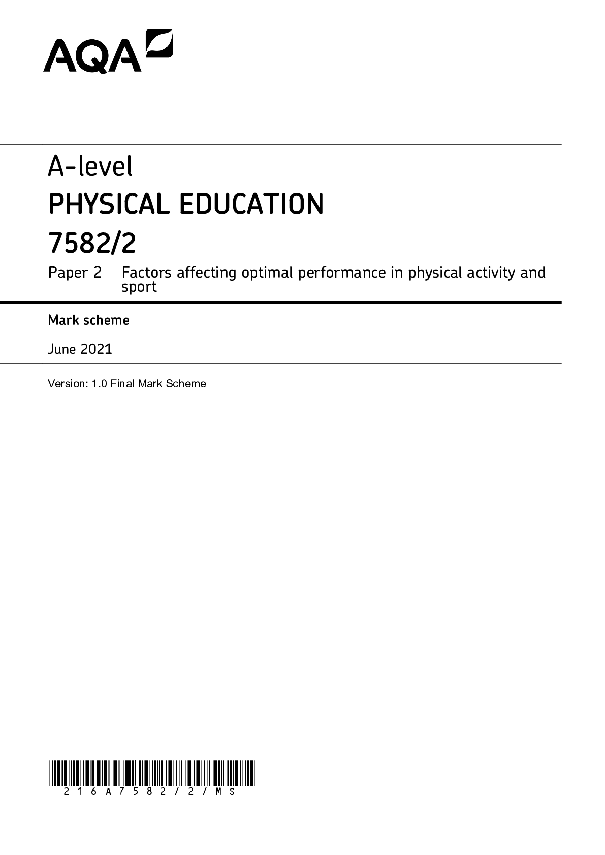 Physical Therapy > AQA > AQA A-level PHYSICAL EDUCATION 7582/2 Paper 2 Factors affecting optimal performance in physical activity and sport Mark scheme June 2021 Version: 1.0 Final Mark Scheme (All)