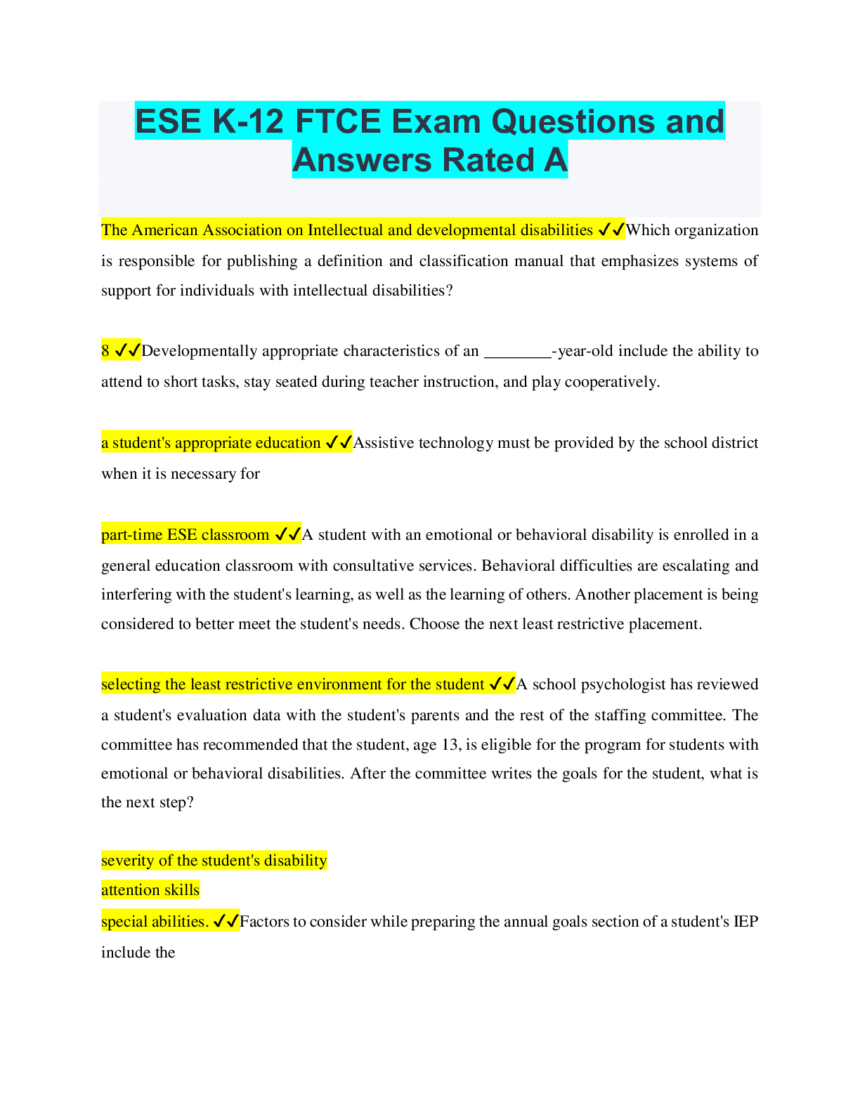 Physical Education > QUESTIONS & ANSWERS > FTCE Exam ESE K-12 Questions and Answers Rated A (All)