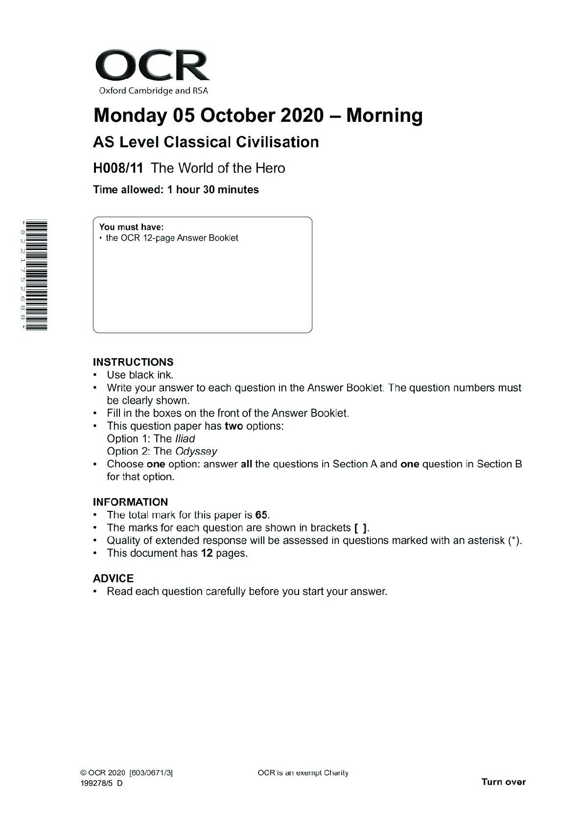 Classical Civilisation > Higher Education > A Level Classical Civilisation_H408/11 Question Paper Oct 2021 | The World of the Hero (All)