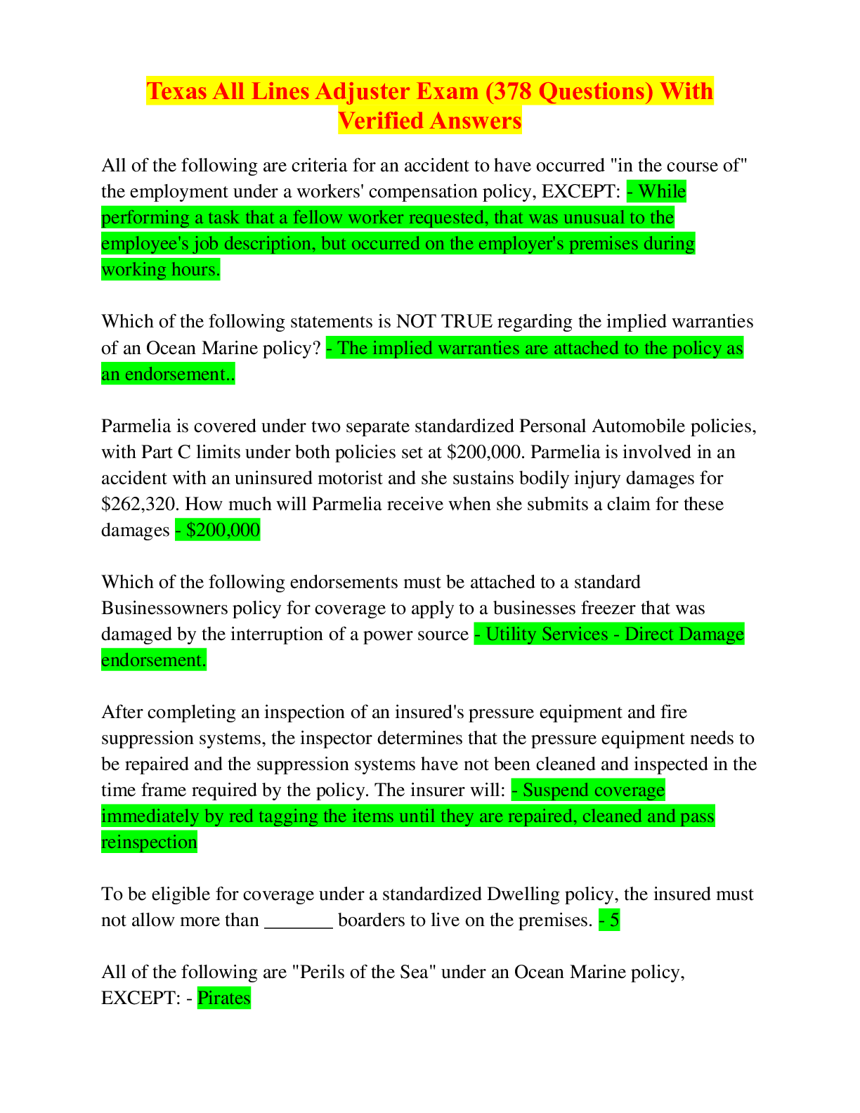 Commerce > EXAM > Texas All Lines Adjuster Exam (378 Questions) With Verified Answers (All)