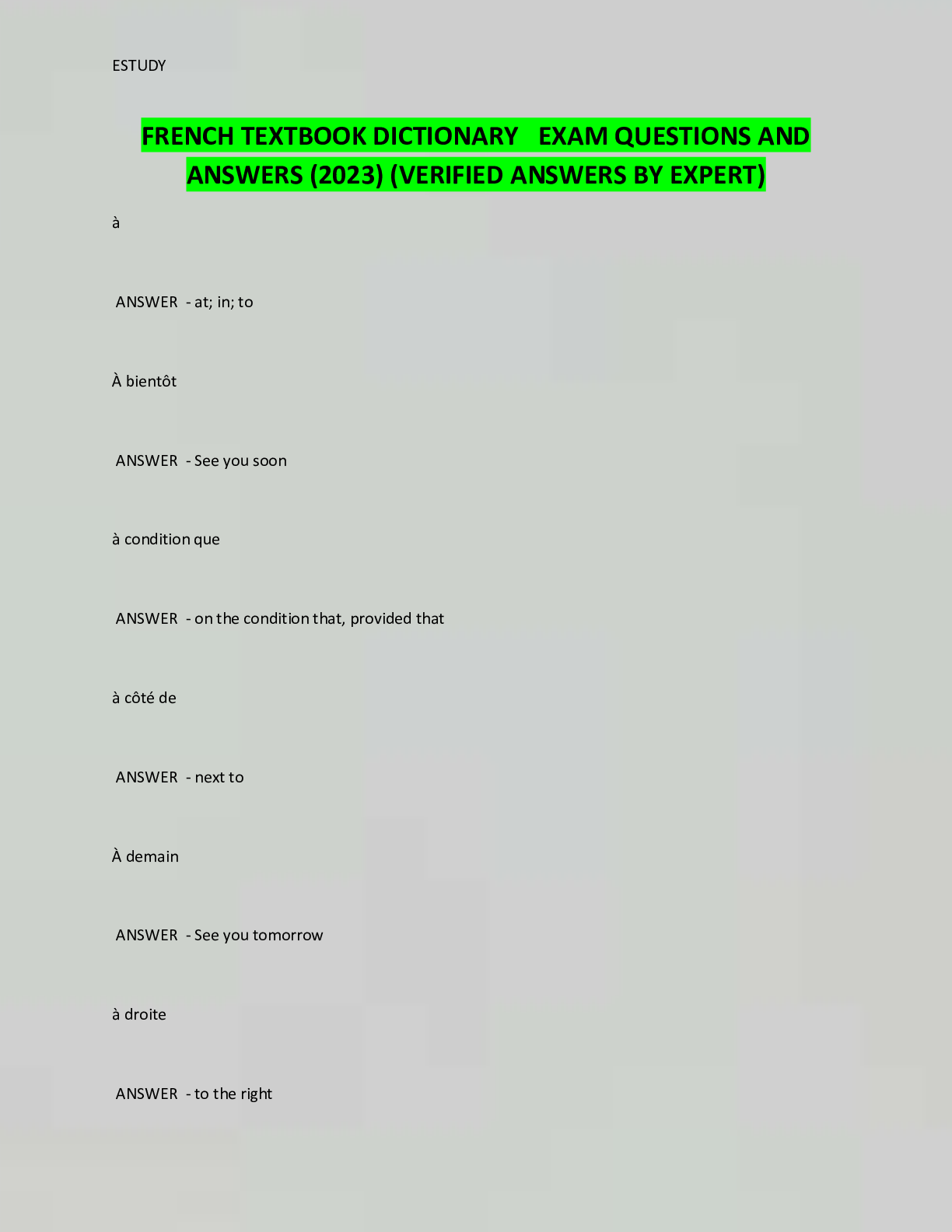 French > QUESTIONS & ANSWERS > FRENCH TEXTBOOK DICTIONARY EXAM QUESTIONS AND ANSWERS (2023) (VERIFIED ANSWERS BY EXPERT) (All)