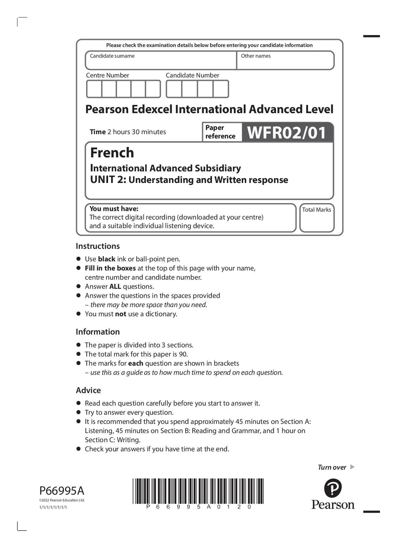 French > Edexcel Question Paper > Pearson Edexcel IAL WFR02/01 AS Level French International Advanced Subsidiary UNIT 2: Understanding and Written response. QP Jan 2022 (All)