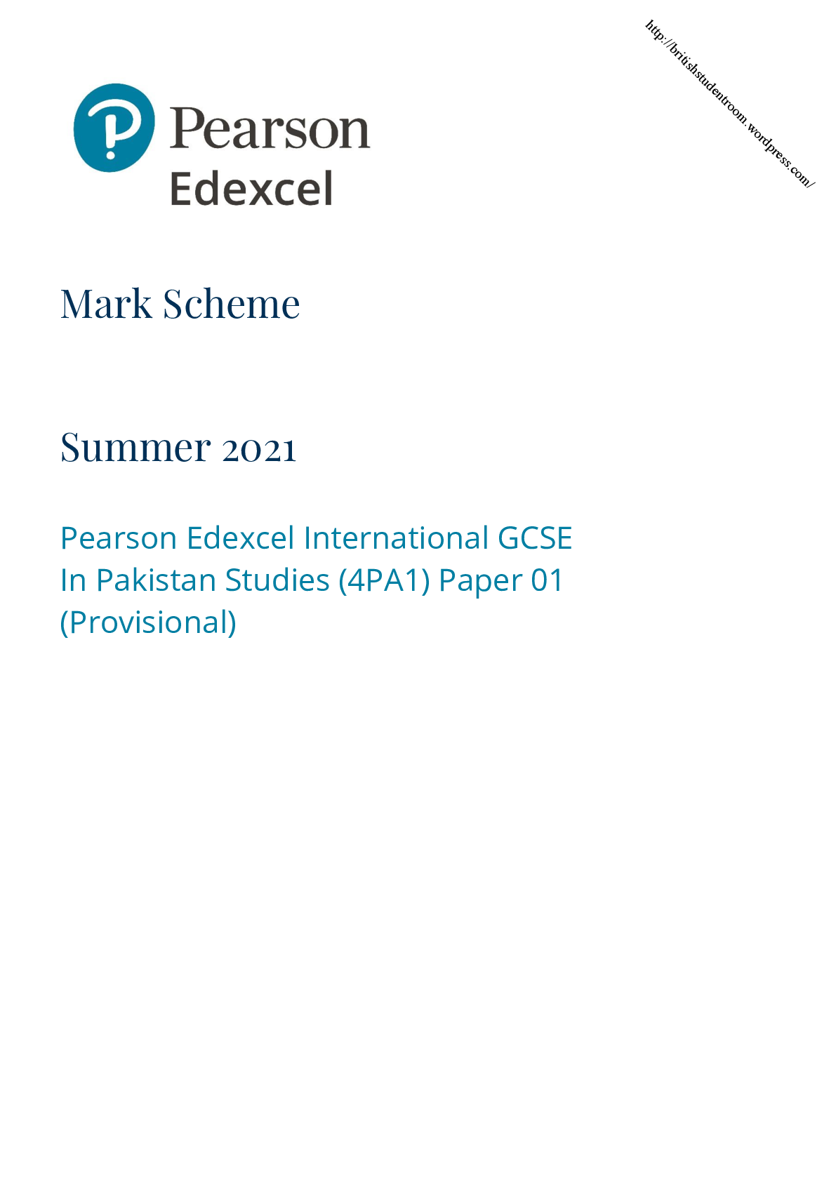 Pakistan Studies > GCSE MARK SCHEME > Mark Scheme Summer 2021 Pearson Edexcel International GCSE In Pakistan Studies (4PA1) Paper 01 (Provisional). Graded A+ (All)